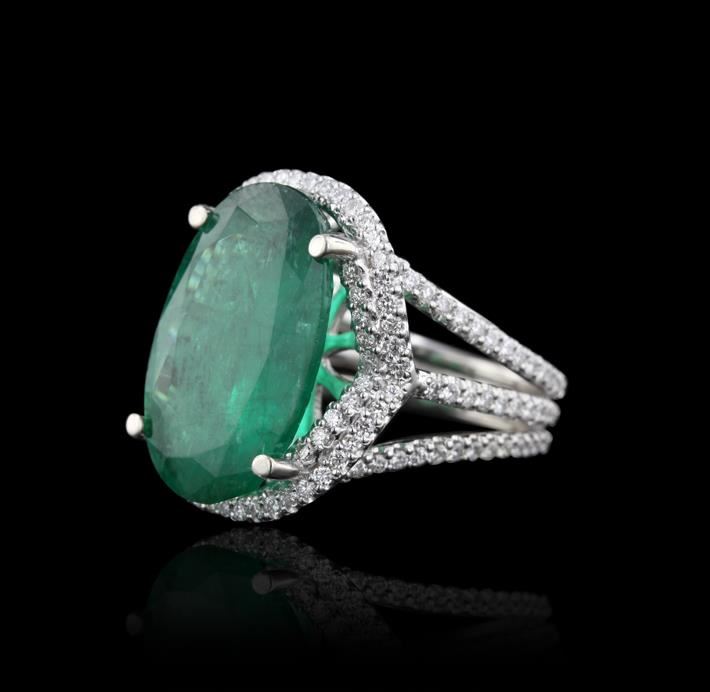 One electronically tested 14KT white gold ladies cast emerald and diamond ring with a bright polish finish. Condition is good. The featured emerald is set within a diamond lattice gallery, supported by diamond set three-way split shoulders and completed by a four and one-half millimeter wide band. Identified with markings of "14K". Containing: One prong set oval mixed cut natural emerald, measuring 20.60 x 13.35 x 8.68mm, approximate weight of 13.24ct., clarity is heavily included, type III, medium dark, moderately strong, very slightly bluish green color, (GIA vslbG 6/4), cut is good. Transmitting light with minimum of distortion, transparent. Naturally occurring internal & external characteristics are present. Indication of oil, & opticon residue. Colored Stone Grading Report attached. Graded in the setting. One hundred fifty-six prong set round brilliant cut diamonds, measuring 1.30-- 1.30 x 0.78mm (depth est.) approximate total weight of 156 Stones = 1.38ct. Graded in the setting. Clarity SI-1 to I-1. Color F - H. Total Weight of Emerald 13.24ct. Total Weight of Diamonds 1.38ct. Total Weight of Ring 12.10gm. AIG Appraised at $42,750.00.