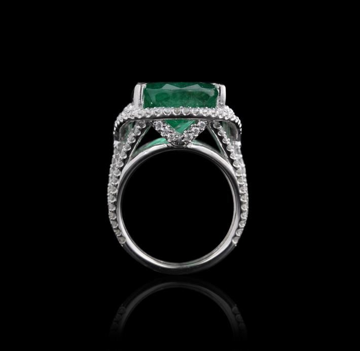 One electronically tested 14KT white gold ladies cast emerald and diamond ring with a bright polish finish. Condition is good. The featured emerald is set within a diamond lattice gallery, supported by diamond set three-way split shoulders and completed by a four and one-half millimeter wide band. Identified with markings of "14K". Containing: One prong set oval mixed cut natural emerald, measuring 20.60 x 13.35 x 8.68mm, approximate weight of 13.24ct., clarity is heavily included, type III, medium dark, moderately strong, very slightly bluish green color, (GIA vslbG 6/4), cut is good. Transmitting light with minimum of distortion, transparent. Naturally occurring internal & external characteristics are present. Indication of oil, & opticon residue. Colored Stone Grading Report attached. Graded in the setting. One hundred fifty-six prong set round brilliant cut diamonds, measuring 1.30-- 1.30 x 0.78mm (depth est.) approximate total weight of 156 Stones = 1.38ct. Graded in the setting. Clarity SI-1 to I-1. Color F - H. Total Weight of Emerald 13.24ct. Total Weight of Diamonds 1.38ct. Total Weight of Ring 12.10gm. AIG Appraised at $42,750.00.