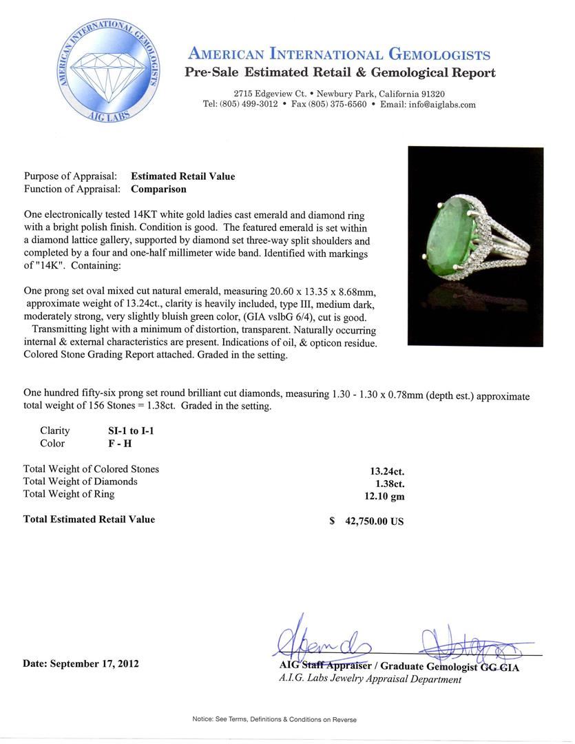 One electronically tested 14KT white gold ladies cast emerald and diamond ring with a bright polish finish. Condition is good. The featured emerald is set within a diamond lattice gallery, supported by diamond set three-way split shoulders and completed by a four and one-half millimeter wide band. Identified with markings of "14K". Containing: One prong set oval mixed cut natural emerald, measuring 20.60 x 13.35 x 8.68mm, approximate weight of 13.24ct., clarity is heavily included, type III, medium dark, moderately strong, very slightly bluish green color, (GIA vslbG 6/4), cut is good. Transmitting light with minimum of distortion, transparent. Naturally occurring internal & external characteristics are present. Indication of oil, & opticon residue. Colored Stone Grading Report attached. Graded in the setting. One hundred fifty-six prong set round brilliant cut diamonds, measuring 1.30-- 1.30 x 0.78mm (depth est.) approximate total weight of 156 Stones = 1.38ct. Graded in the setting. Clarity SI-1 to I-1. Color F - H. Total Weight of Emerald 13.24ct. Total Weight of Diamonds 1.38ct. Total Weight of Ring 12.10gm. AIG Appraised.
