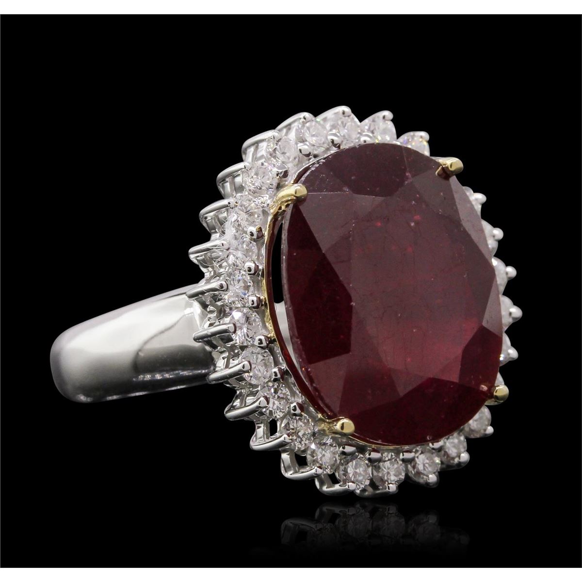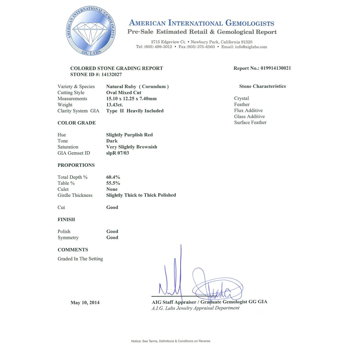 One electronically tested 14KT white gold ladies cast ruby and diamond ring with a bright polish finish. Condition is new, good workmanship. The featured ruby is set within a diamond bezel, completed by a three millimeter wide band. Identified with markings of "14K". Containing: One prong set oval mixed cut natural ruby, measuring 15.10 x 12.25 x 7.40mm, 20%. bulge factor, approximate weight of 13.43ct., clarity is heavily included, type II, dark, very slightly brownish, slightly purplish red color, (GIA slpR 7/3), cut is good. Transmitting light somewhat diffusely, transparent to translucent. Naturally occurring internal & external characteristics are present. Indications of laboratory high temperature heat treatment, with glass & flux additives. Colored Stone Grading Report attached. Graded in the setting. Ruby has a low tolerance to rhodium plating, repolishing the surface, & ultrasonic cleaning. Twenty-Six prong set round brilliant cut diamonds, measuring 2.00 - 1.90 x 1.17mm (depth est.) approximate. Total Weight of 26 Stones = 0.77ct. Graded in the setting. Clarity: SI-1 to I-1. Color: G - I. Total Weight of Colored Stones 13.43ct. Total Weight of Diamonds 0.77ct. Total Weight of Ring 8.40grams. AIG Appraised at $6,790.00.