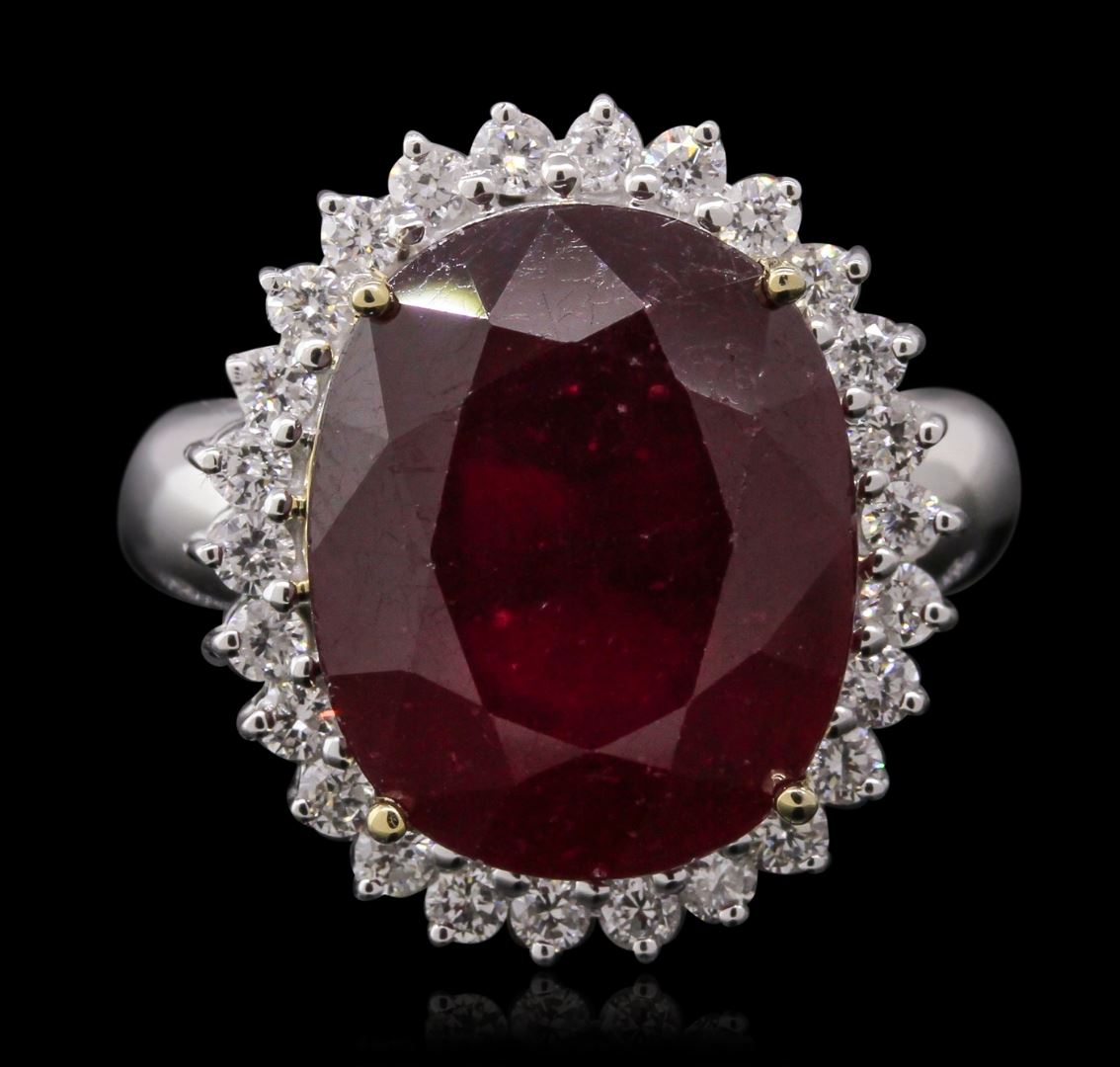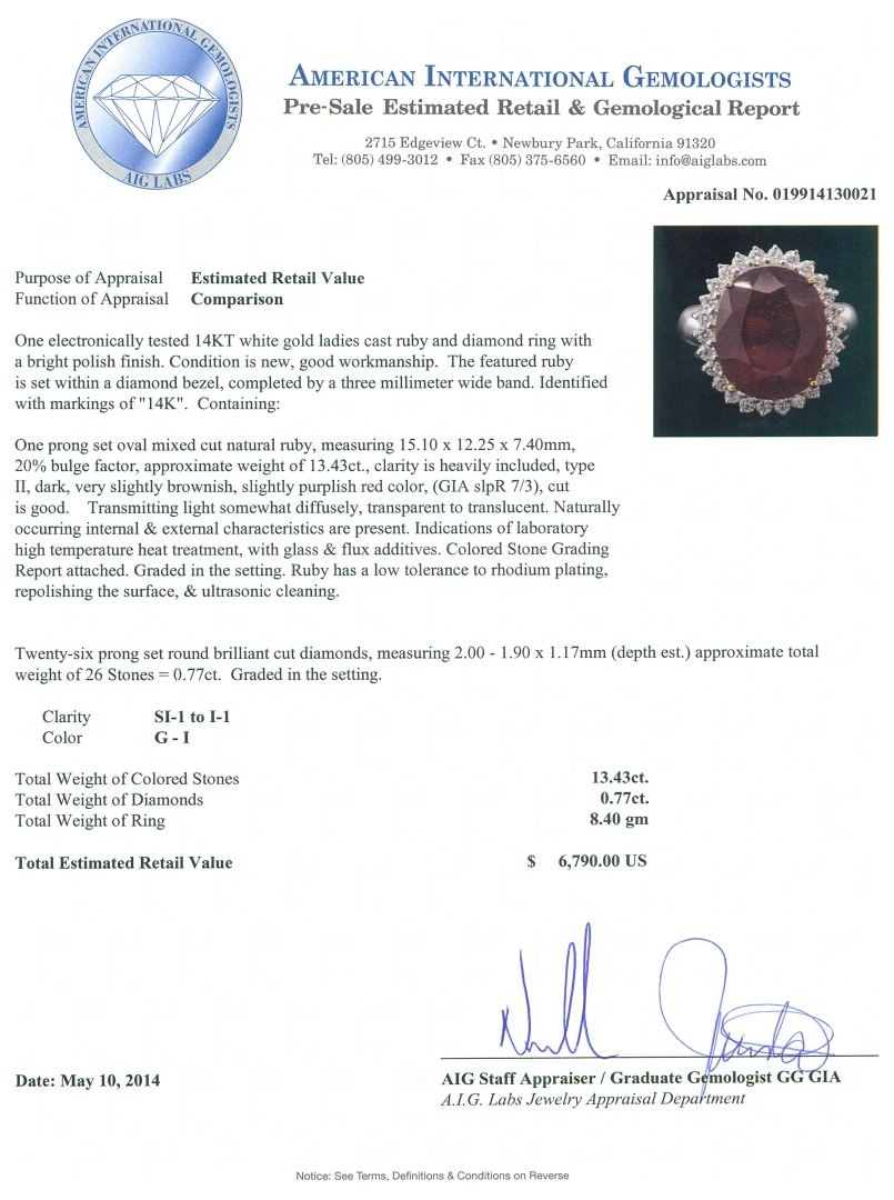 One electronically tested 14KT white gold ladies cast ruby and diamond ring with a bright polish finish. Condition is new, good workmanship. The featured ruby is set within a diamond bezel, completed by a three millimeter wide band. Identified with markings of "14K". Containing: One prong set oval mixed cut natural ruby, measuring 15.10 x 12.25 x 7.40mm, 20%. bulge factor, approximate weight of 13.43ct., clarity is heavily included, type II, dark, very slightly brownish, slightly purplish red color, (GIA slpR 7/3), cut is good. Transmitting light somewhat diffusely, transparent to translucent. Naturally occurring internal & external characteristics are present. Indications of laboratory high temperature heat treatment, with glass & flux additives. Colored Stone Grading Report attached. Graded in the setting. Ruby has a low tolerance to rhodium plating, repolishing the surface, & ultrasonic cleaning. Twenty-Six prong set round brilliant cut diamonds, measuring 2.00 - 1.90 x 1.17mm (depth est.) approximate. Total Weight of 26 Stones = 0.77ct. Graded in the setting. Clarity: SI-1 to I-1. Color: G - I. Total Weight of Colored Stones 13.43ct. Total Weight of Diamonds 0.77ct. Total Weight of Ring 8.40grams. AIG Appraised at $6,790.00.