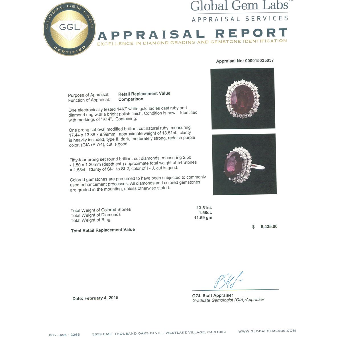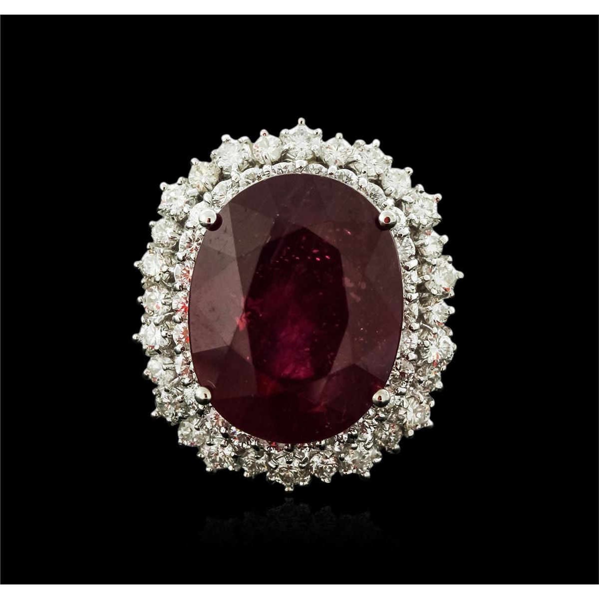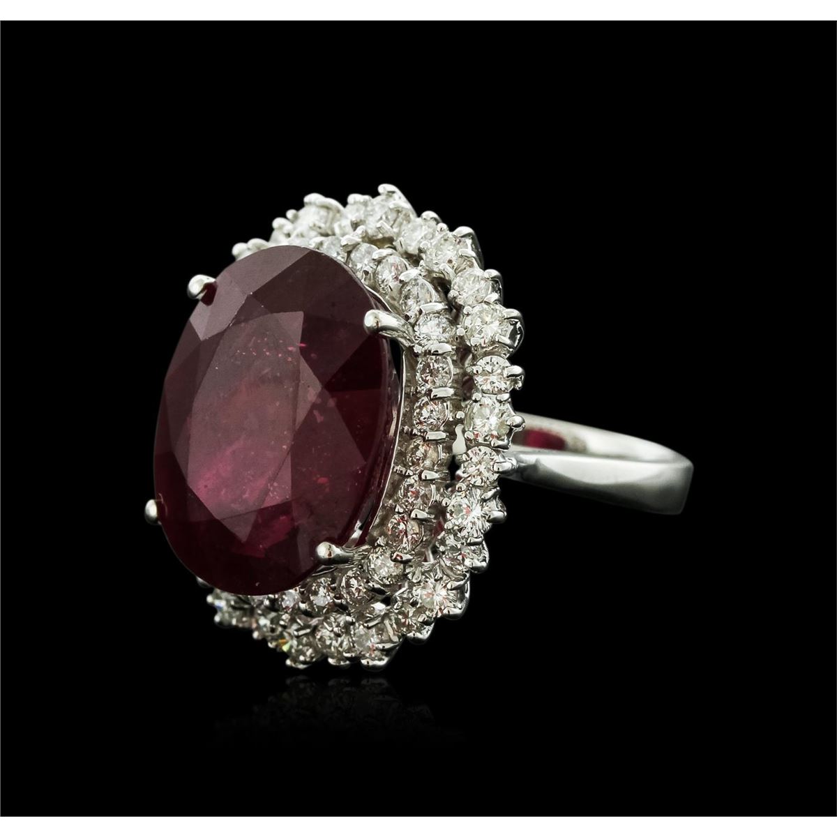 One electronically tested 14KT white gold ladies cast ruby and diamond ring with a bright polish finish. Identified with markings of "K14". Condition is new. Containing: One prong set oval modified brilliant cut natural ruby, measuring 17.44 x 13.88 x 9.99mm, approximate weight of 13.51ct., clarity is heavily included, type II, dark, moderately strong, reddish purple color, (GIA rP 7/4), cut is good. Fifty-Four prong set round brilliant cut diamonds, measuring 2.50 - 1.50 x 1.20mm (depth est.) approximate total weight of 54 Stones = 1.58ct. Clarity: SI-1 to SI-2. Color: I - J, Cut is Good. Colored gemstones are presumed to have been subjected to commonly used enhancement processes. All diamonds and colored gemstones are graded in the mounting, unless otherwise stated. Total Weight of Colored Stones 13.51ct. Total Weight of Diamonds 1.58ct. Total Weight of Ring 11.59 grams. GGL Appraised at $6,435.00.
