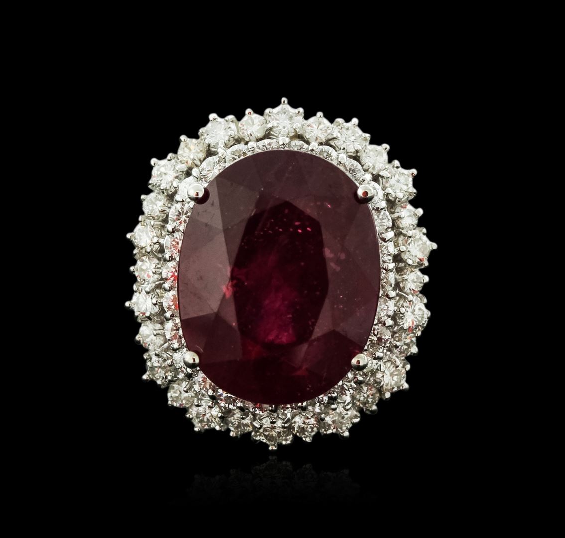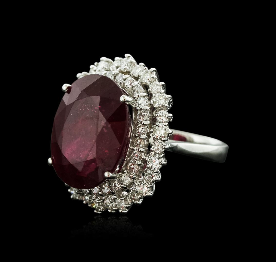 One electronically tested 14KT white gold ladies cast ruby and diamond ring with a bright polish finish. Identified with markings of "K14". Condition is new. Containing: One prong set oval modified brilliant cut natural ruby, measuring 17.44 x 13.88 x 9.99mm, approximate weight of 13.51ct., clarity is heavily included, type II, dark, moderately strong, reddish purple color, (GIA rP 7/4), cut is good. Fifty-Four prong set round brilliant cut diamonds, measuring 2.50 - 1.50 x 1.20mm (depth est.) approximate total weight of 54 Stones = 1.58ct. Clarity: SI-1 to SI-2. Color: I - J, Cut is Good. Colored gemstones are presumed to have been subjected to commonly used enhancement processes. All diamonds and colored gemstones are graded in the mounting, unless otherwise stated. Total Weight of Colored Stones 13.51ct. Total Weight of Diamonds 1.58ct. Total Weight of Ring 11.59 grams. GGL Appraised at $6,435.00.