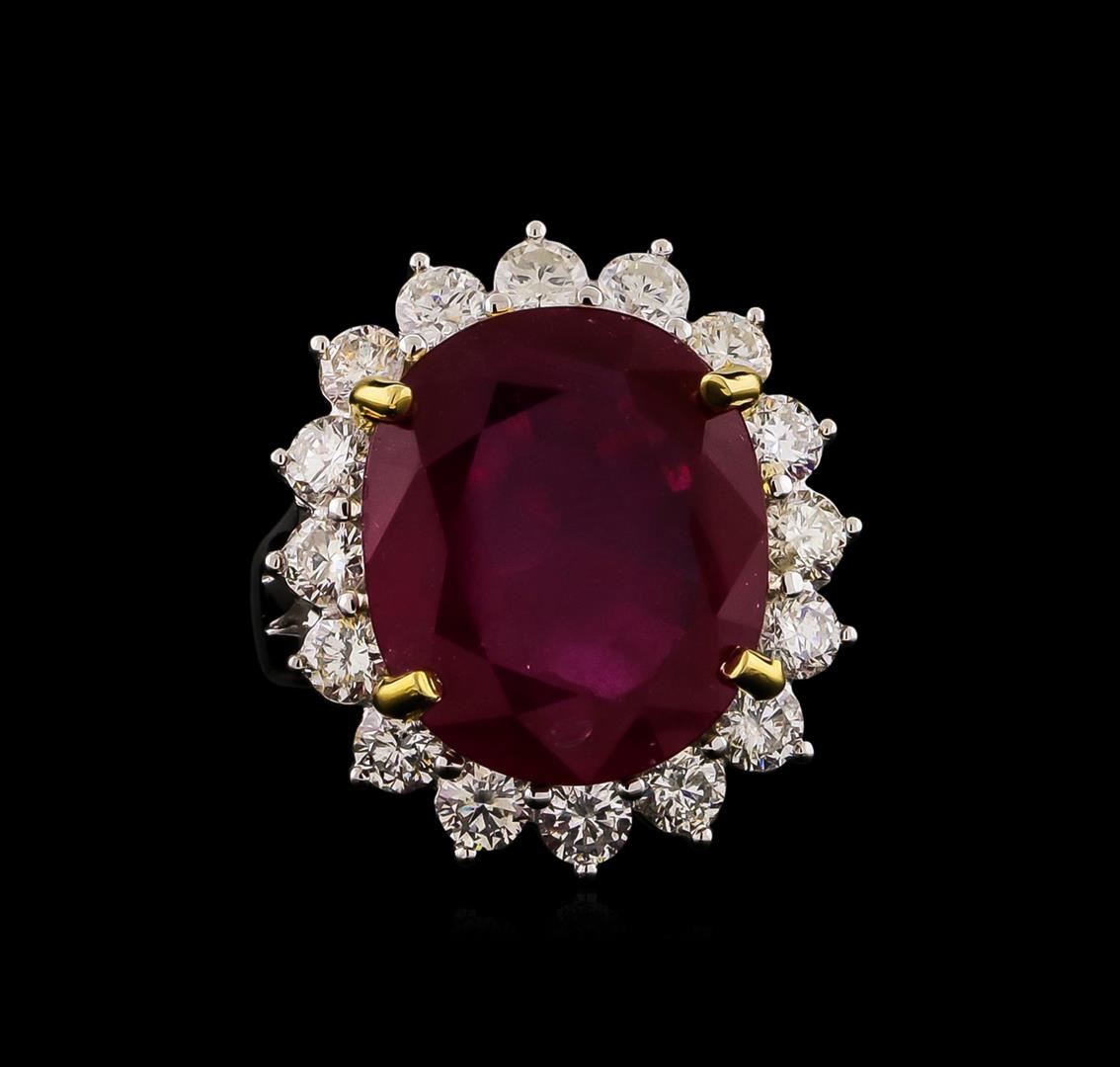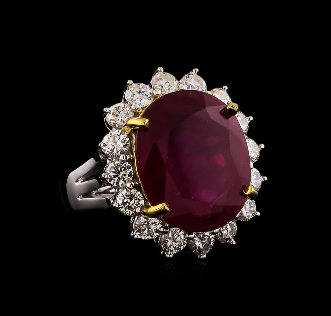 One electronically tested 14KT white gold ladies cast ruby and diamond ring. The featured ruby is set within a diamond bezel, completed by a three and one-half millimeter wide band. Bright polish finish with yellow gold accents. Identified with markings of "14K". Condition is new, good workmanship. Containing: One prong set oval mixed cut natural ruby, measuring 16.80 x 14.20 x 6.50mm, 10%. bulge factor, approximate weight of 13.74ct., clarity is heavily included, type II, medium dark, moderately strong, red color, (GIA R 6/4), cut is good. Transmitting light somewhat diffusely, transparent to translucent. Naturally occurring internal & external characteristics are present. Indications of laboratory high temperature heat treatment, with glass & flux additives. Graded in the setting. Ruby has a low tolerance to rhodium plating, repolishing the surface, & ultrasonic cleaning. Sixteen prong set round brilliant cut diamonds, measuring 3.30 - 3.20 x 1.95mm (depth est.) approximate total weight of 16 Stones = 2.11ct. Graded in the setting. Clarity: SI-2 to I-1. Color: G - I. Total Weight of Colored Stones 13.74ct. Total Weight of Diamonds 2.11ct. Total Weight of Ring 11.60 grams. AIG Appraised at $10,505.00.