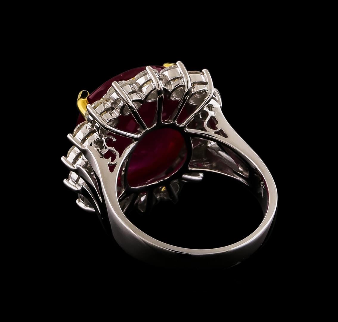 One electronically tested 14KT white gold ladies cast ruby and diamond ring. The featured ruby is set within a diamond bezel, completed by a three and one-half millimeter wide band. Bright polish finish with yellow gold accents. Identified with markings of "14K". Condition is new, good workmanship. Containing: One prong set oval mixed cut natural ruby, measuring 16.80 x 14.20 x 6.50mm, 10%. bulge factor, approximate weight of 13.74ct., clarity is heavily included, type II, medium dark, moderately strong, red color, (GIA R 6/4), cut is good. Transmitting light somewhat diffusely, transparent to translucent. Naturally occurring internal & external characteristics are present. Indications of laboratory high temperature heat treatment, with glass & flux additives. Graded in the setting. Ruby has a low tolerance to rhodium plating, repolishing the surface, & ultrasonic cleaning. Sixteen prong set round brilliant cut diamonds, measuring 3.30 - 3.20 x 1.95mm (depth est.) approximate total weight of 16 Stones = 2.11ct. Graded in the setting. Clarity: SI-2 to I-1. Color: G - I. Total Weight of Colored Stones 13.74ct. Total Weight of Diamonds 2.11ct. Total Weight of Ring 11.60 grams. AIG Appraised at $10,505.00.