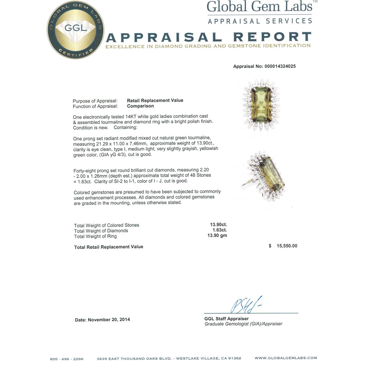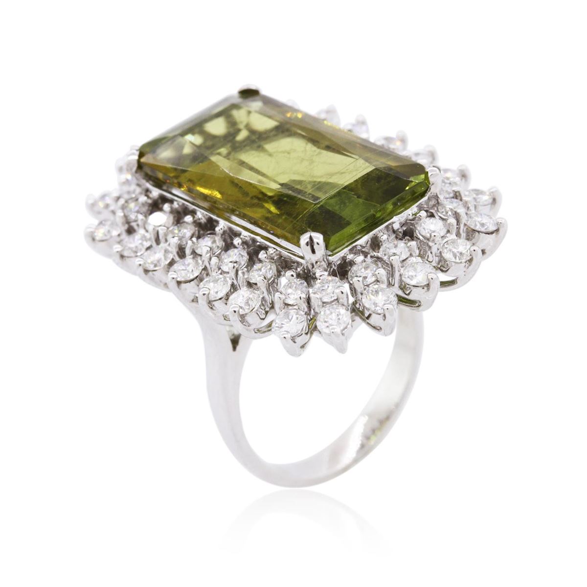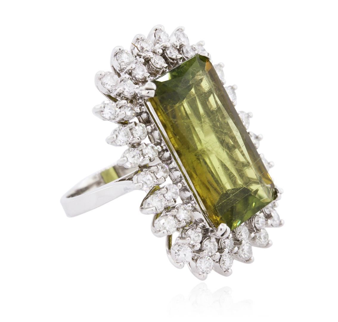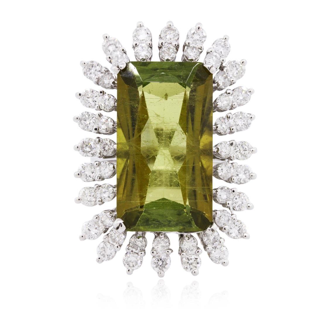 One electronically tested 14KT white gold ladies combination cast & assembled tourmaline and diamond ring with a bright polish finish. Condition is new. Containing: One prong set radiant modified mixed cut natural green tourmaline, measuring 21.29 x 11.00 x 7.46mm, approximate weight of 13.90ct., clarity is eye clean, type I, medium light, very slightly grayish, yellowish green color, (GIA yG 4/3), cut is good. Forty-Eight prong set round brilliant cut diamonds, measuring 2.20 - 2.00 x 1.26mm (depth est.) approximate total weight of 48 Stones = 1.63ct. Clarity: SI-2 to I-1. Color: I - J, Cut is Good. Colored gemstones are presumed to have been subjected to commonly used enhancement processes. All diamonds and colored gemstones are graded in the mounting, unless otherwise stated. Total Weight of Colored Stones 13.90ct. Total Weight of Diamonds 1.63ct. Total Weight of Ring 13.90 grams. GGL Appraised at $15,550.00.