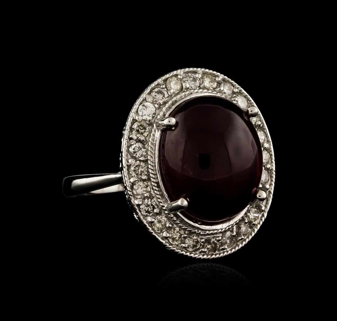One electronically tested 14KT white gold ladies cast ruby and diamond ring with a bright polish finish. Identified with markings of "14K". Condition is new. Containing: One prong set oval cabochon cut natural ruby, measuring 14.20 x 12.10 x 7.50mm, approximate weight of 13.92ct., clarity is heavily included, type II, medium dark, moderately strong, strongly purplish red color, (GIA stpR 6/4), cut is good. Twenty-Five prong set round brilliant cut diamonds, measuring 1.80 - 1.80 x 1.08mm (depth est.) approximate total weight of 25 Stones = 0.53ct. Clarity: SI-1 to I-1. Color: J - K, Cut is Good. Colored gemstones are presumed to have been subjected to commonly used enhancement processes, All diamonds and colored gemstones are graded in the mounting, unless otherwise stated. Total Weight of Colored Stones 13.92ct. Total Weight of Diamonds 0.53ct. Total Weight of Ring 9.20 grams. GGL Appraised at $4,850.00.