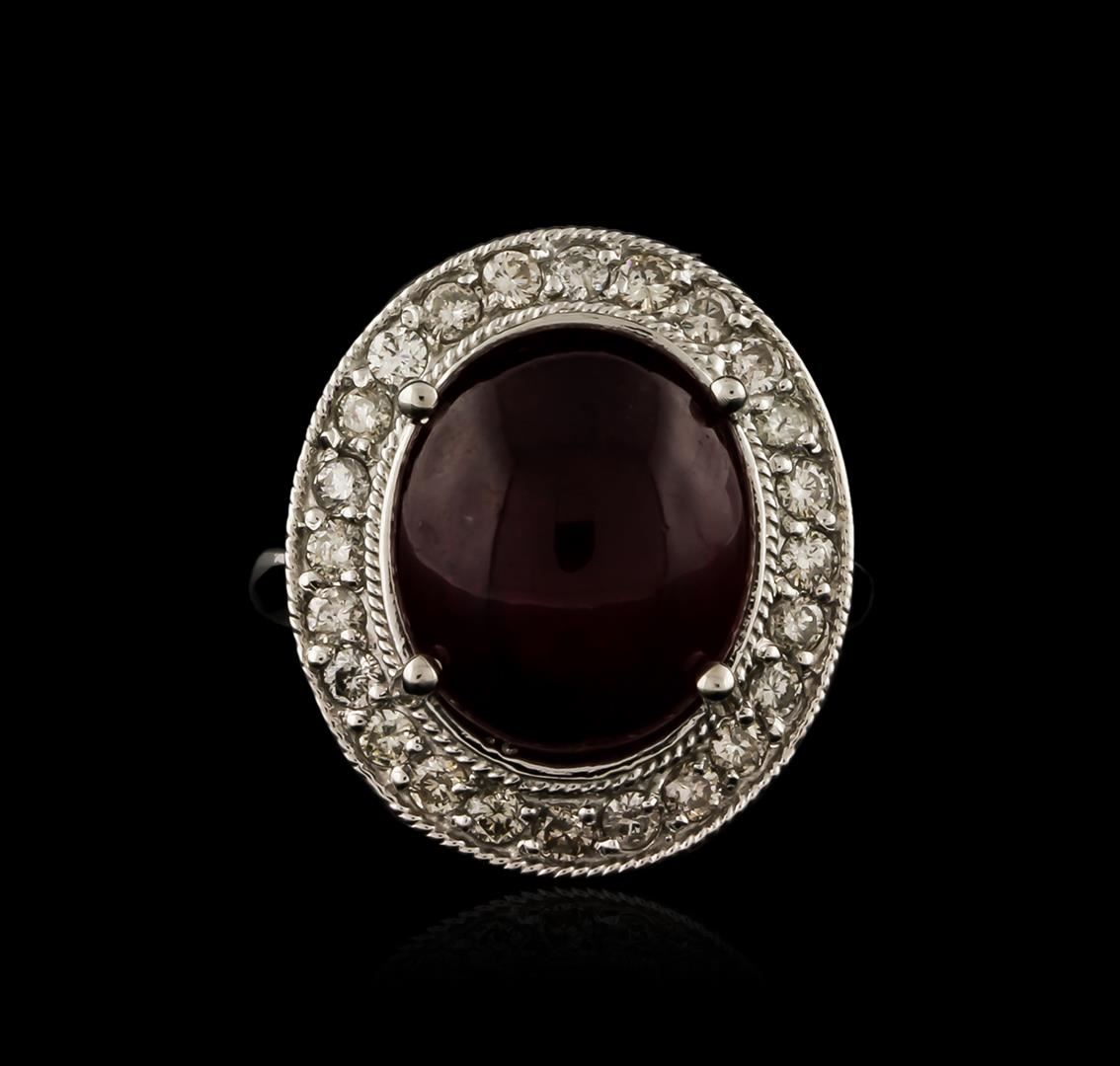 One electronically tested 14KT white gold ladies cast ruby and diamond ring with a bright polish finish. Identified with markings of "14K". Condition is new. Containing: One prong set oval cabochon cut natural ruby, measuring 14.20 x 12.10 x 7.50mm, approximate weight of 13.92ct., clarity is heavily included, type II, medium dark, moderately strong, strongly purplish red color, (GIA stpR 6/4), cut is good. Twenty-Five prong set round brilliant cut diamonds, measuring 1.80 - 1.80 x 1.08mm (depth est.) approximate total weight of 25 Stones = 0.53ct. Clarity: SI-1 to I-1. Color: J - K, Cut is Good. Colored gemstones are presumed to have been subjected to commonly used enhancement processes, All diamonds and colored gemstones are graded in the mounting, unless otherwise stated. Total Weight of Colored Stones 13.92ct. Total Weight of Diamonds 0.53ct. Total Weight of Ring 9.20 grams. GGL Appraised at $4,850.00.