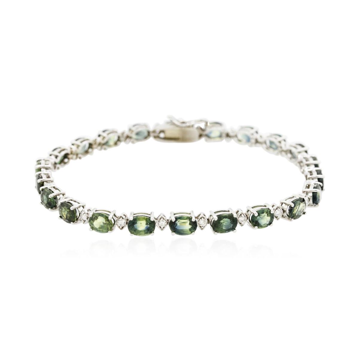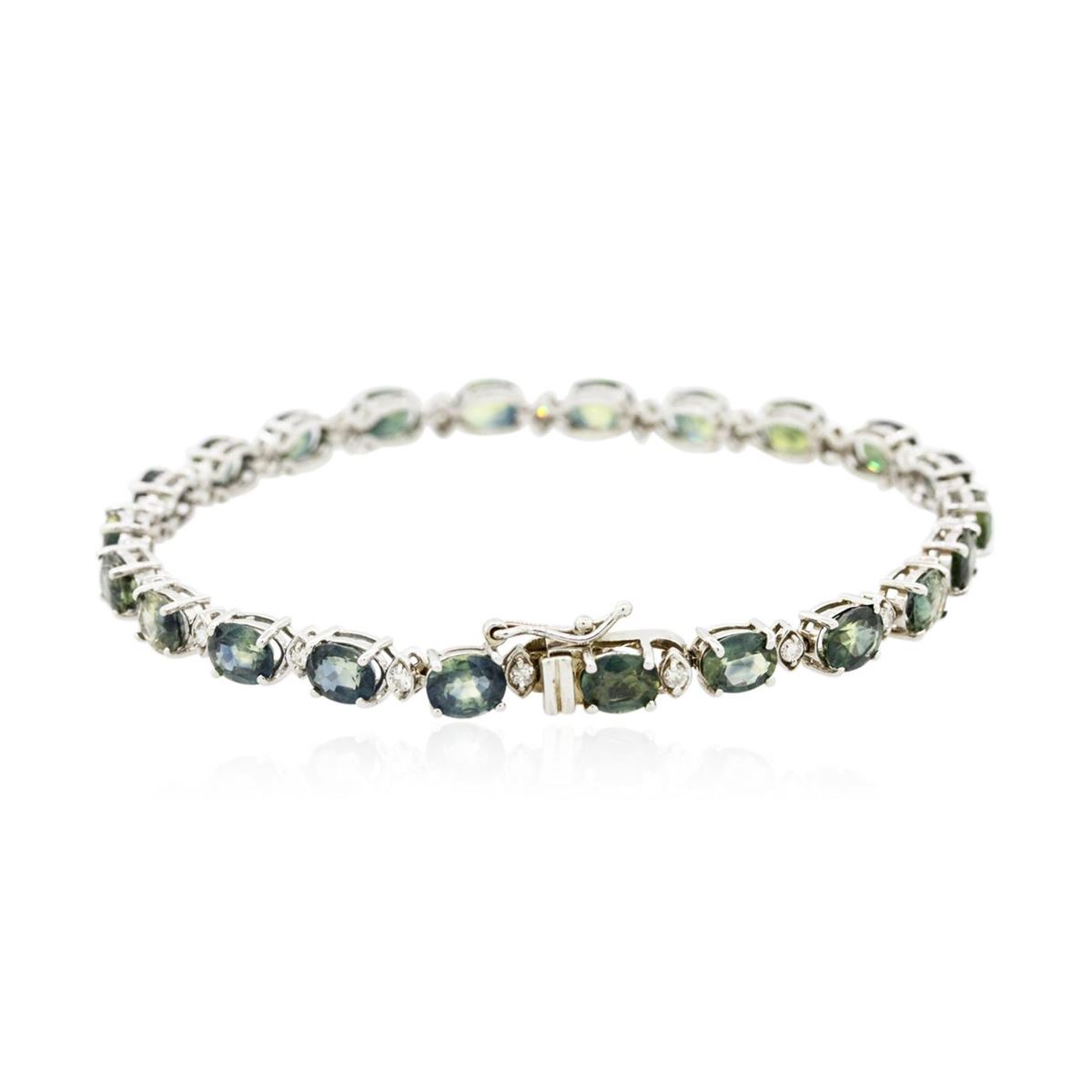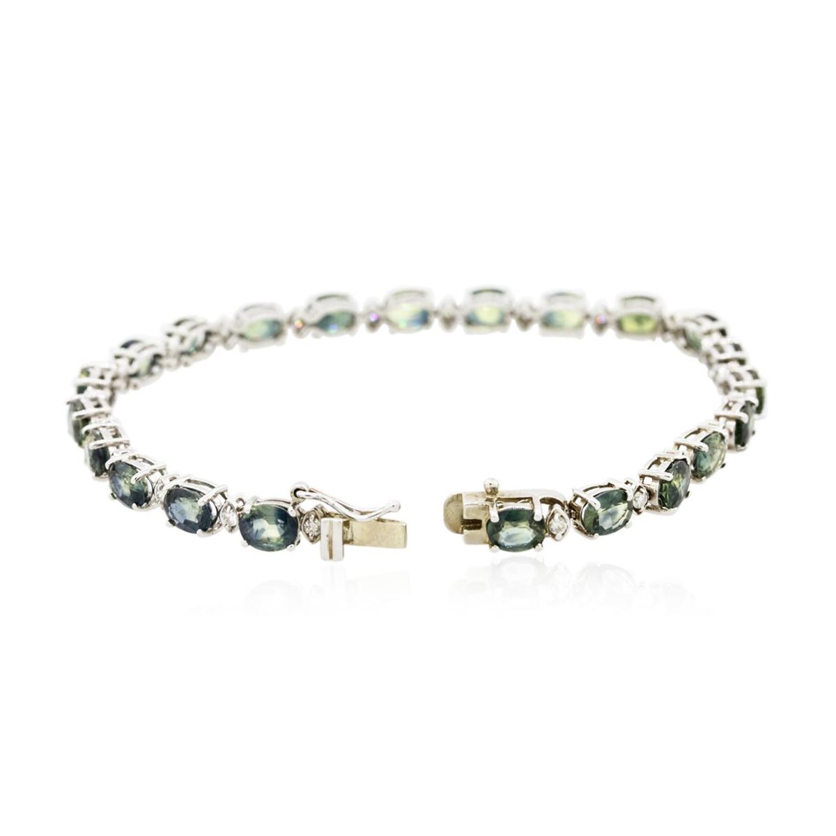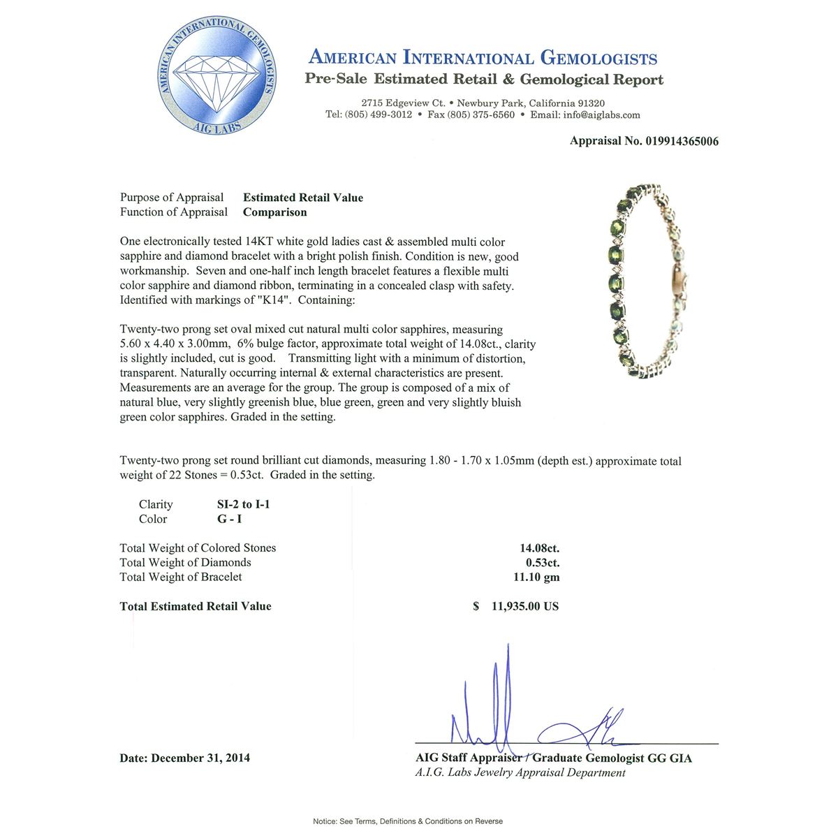 One electronically tested 14KT white gold ladies cast & assembled multi color sapphire and diamond bracelet with a bright polish finish. Seven and one-half inch length bracelet features a flexible multi color sapphire and diamond ribbon, terminating in a concealed clasp with safety. Identified with markings of "K14". Condition is new, good workmanship. Containing: Twenty-two prong set oval mixed cut natural multi color sapphires, measuring 5.60 x 4.40 x 3.00mm, 6% bulge factor, approximate total weight of 14.08ct., clarity is slightly included, cut is good. Transmitting light with a minimum of distortion, transparent. Naturally occurring internal & external characteristics are present. Measurements are an average for the group. The group is composed of a mix of natural blue, very slightly greenish blue, blue green, green and very slightly bluish green color sapphires. Graded in the setting. Twenty-Two prong set round brilliant cut diamonds, measuring 1.80 - 1.70 x 1.05mm (depth est.) approximate total weight of 22 Stones = 0.53ct. Graded in the setting. Clarity: SI-2 to I-1. Color: G - I. Total Weight of Colored Stones 14.08ct. Total Weight of Diamonds 0.53ct. Total Weight of Bracelet 11.10 grams. AIG Appraised at $11,935.00.