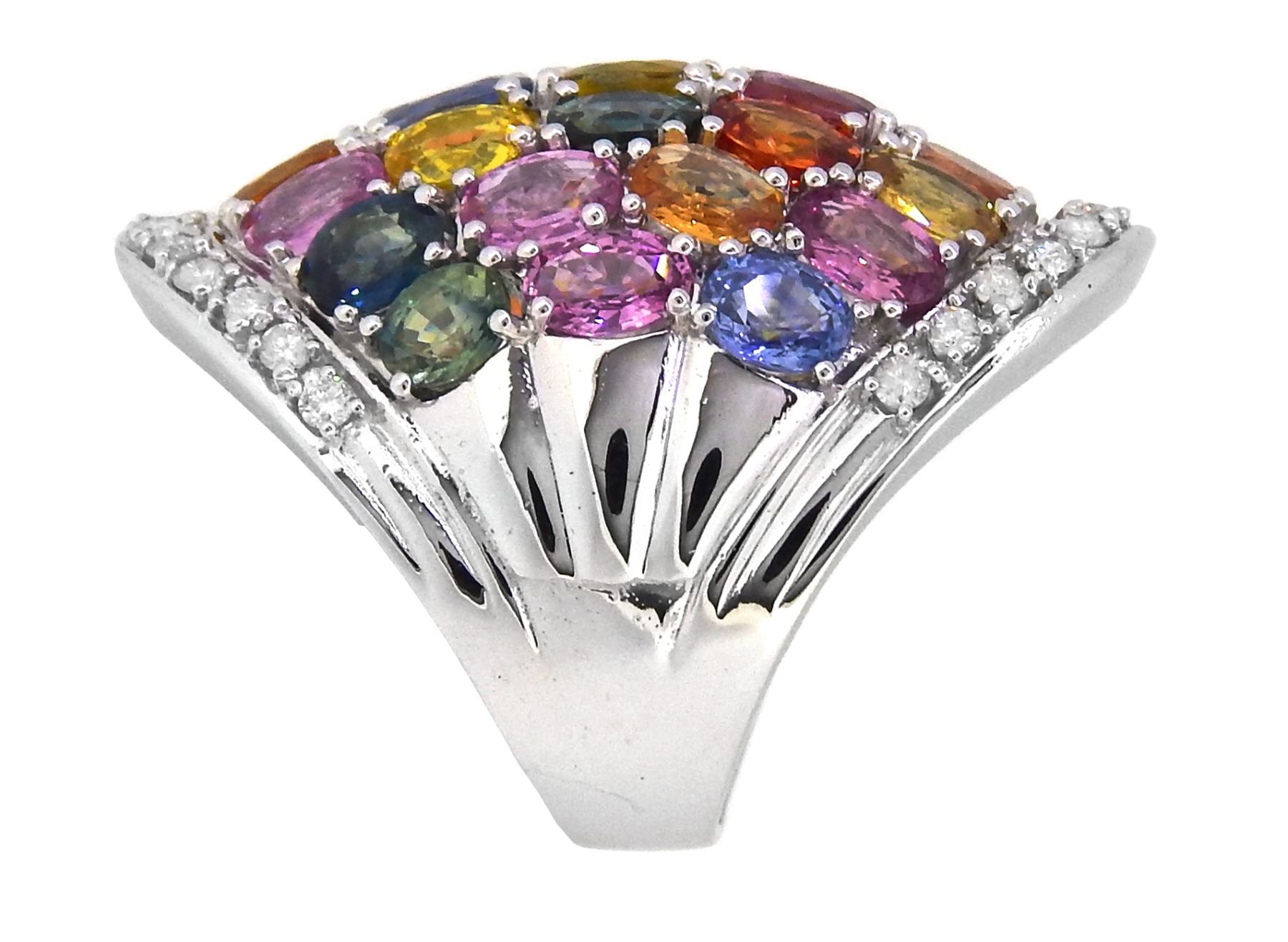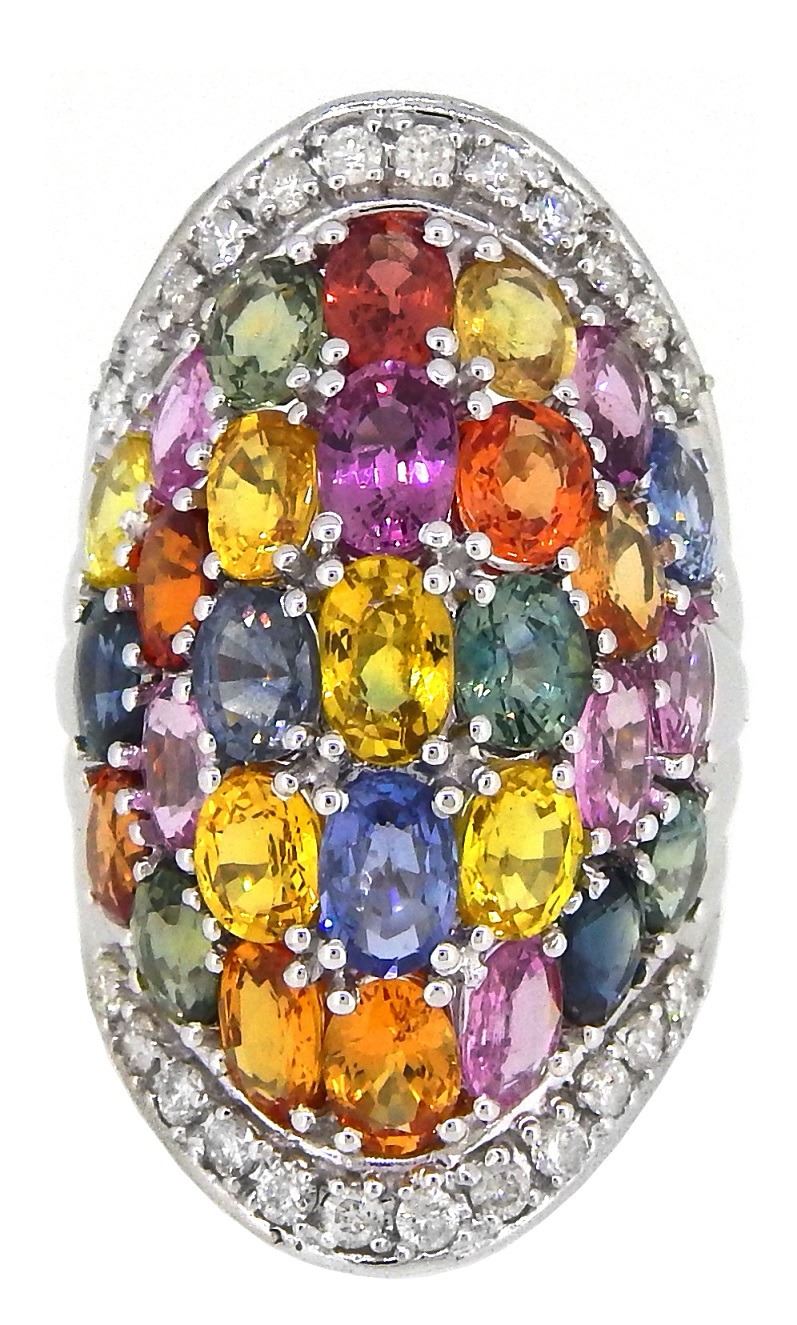 One 14KT White Gold 14.12ctw Multi Color Sapphire and Diamond Ring. (29) Multi Color Sapphire stones with a total weight of 14.12cts. (24) Diamonds with a total weight of 0.66cts. Total weight of this ring is 17.0 grams.