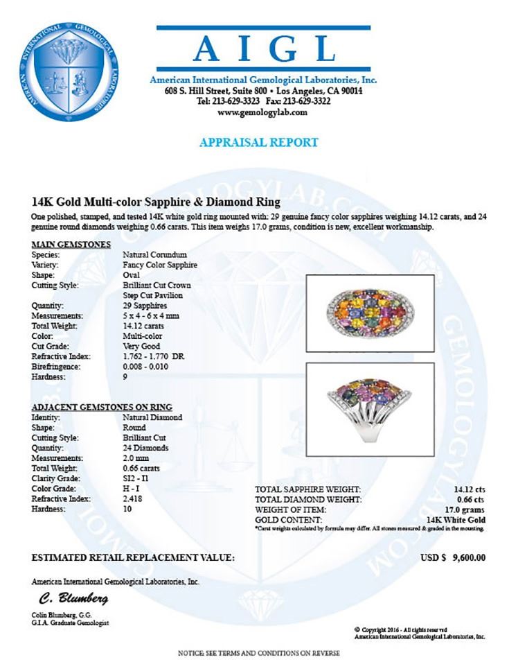 One 14KT White Gold 14.12ctw Multi Color Sapphire and Diamond Ring. (29) Multi Color Sapphire stones with a total weight of 14.12cts. (24) Diamonds with a total weight of 0.66cts. Total weight of this ring is 17.0 grams.