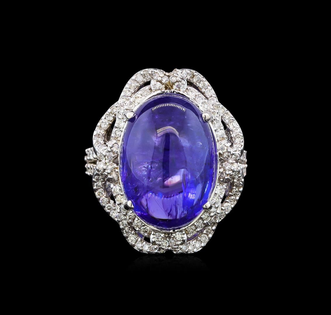One electronically tested 14KT white gold ladies cast tanzanite and diamond ring with a bright polish finish. Identified with markings of "14K". Condition is new. Containing: One prong set oval cabochon cut natural tanzanite, measuring 16.90 x 12.05 x 7.83mm, approximate weight of 14.42ct., clarity is moderately included, type I, medium light, moderately strong, violet color, (GIA V 4/4), cut is good. One Hundred Four prong set round brilliant cut diamonds, measuring 1.30 - 1.30 x 0.78mm (depth est.) approximate total weight of 104 Stones = 0.83ct. Clarity: SI-1 to I-1. Color: I - J, Cut is Good. Colored gemstones are presumed to have been subjected to commonly used enhancement processes. All diamonds and colored gemstones are graded in the mounting, unless otherwise stated. Total Weight of Colored Stones 14.42ct. Total Weight of Diamonds 0.83ct. Total Weight of Ring 10.50 grams. GGL Appraised at $6,790.00.