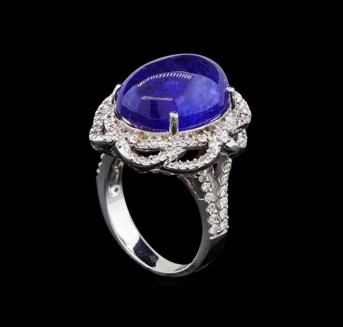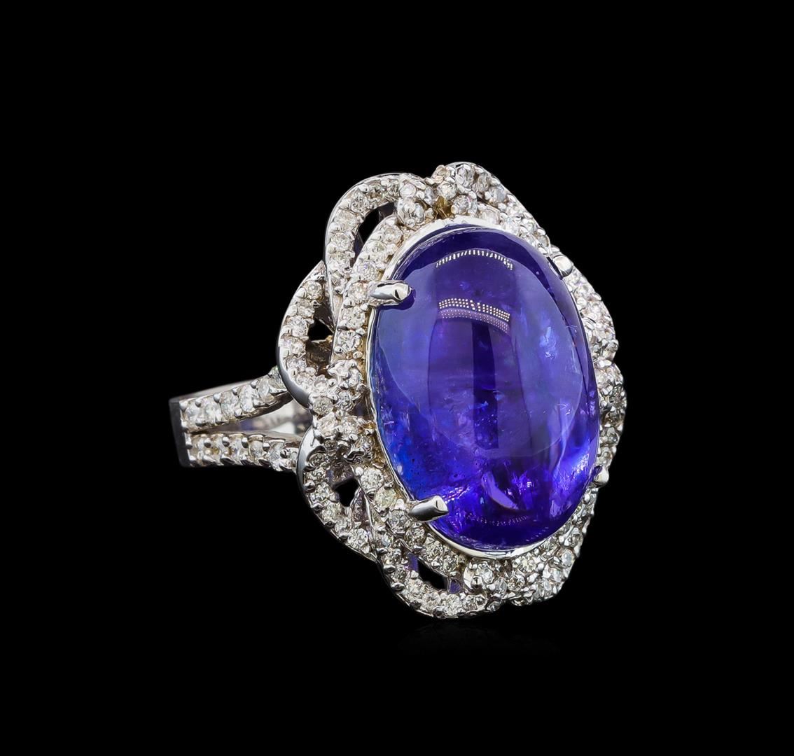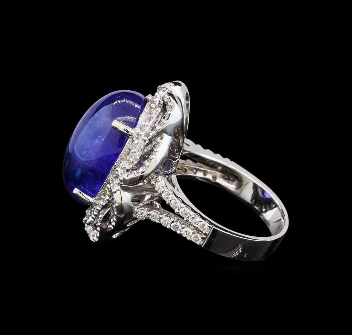 One electronically tested 14KT white gold ladies cast tanzanite and diamond ring with a bright polish finish. Identified with markings of "14K". Condition is new. Containing: One prong set oval cabochon cut natural tanzanite, measuring 16.90 x 12.05 x 7.83mm, approximate weight of 14.42ct., clarity is moderately included, type I, medium light, moderately strong, violet color, (GIA V 4/4), cut is good. One Hundred Four prong set round brilliant cut diamonds, measuring 1.30 - 1.30 x 0.78mm (depth est.) approximate total weight of 104 Stones = 0.83ct. Clarity: SI-1 to I-1. Color: I - J, Cut is Good. Colored gemstones are presumed to have been subjected to commonly used enhancement processes. All diamonds and colored gemstones are graded in the mounting, unless otherwise stated. Total Weight of Colored Stones 14.42ct. Total Weight of Diamonds 0.83ct. Total Weight of Ring 10.50 grams. GGL Appraised at $6,790.00.