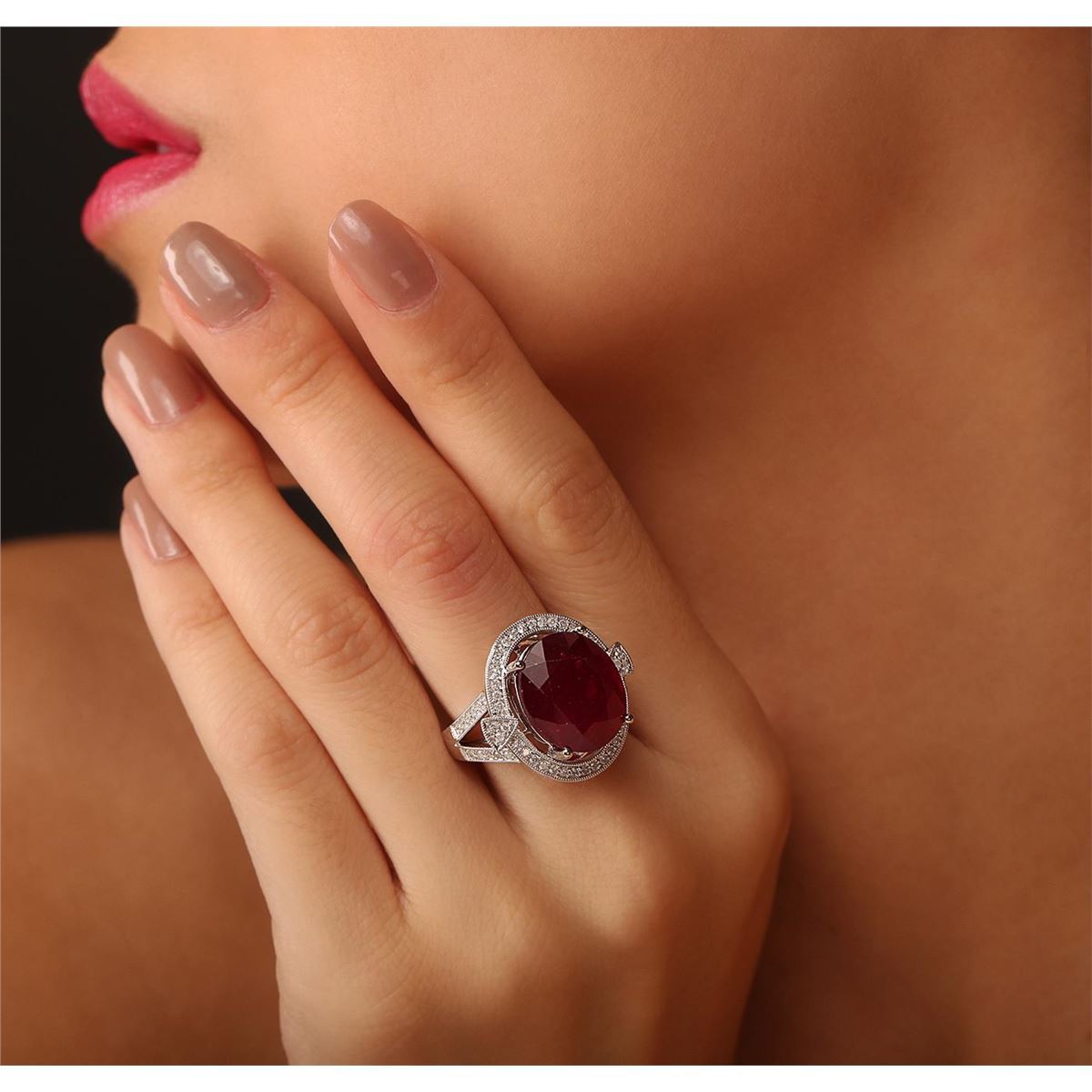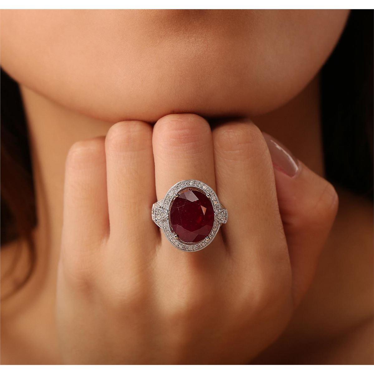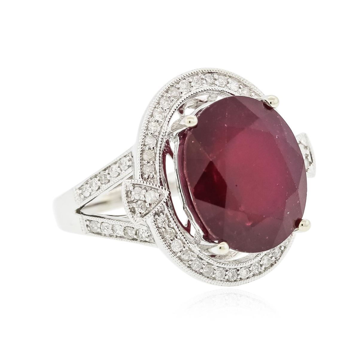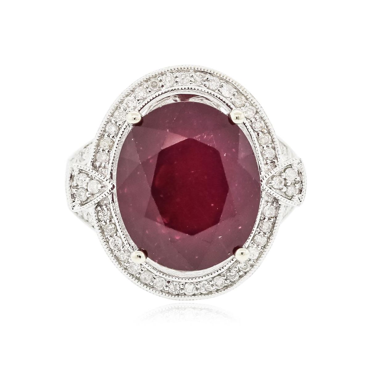 One electronically tested 14KT white gold ladies cast ruby and diamond ring. Condition is new, good workmanship. The featured ruby is set within a diamond bezel supported by diamond set split shoulders, completed by a one and one-half millimeter wide band. Bright polish finish with milgrain detailing throughout. Trademark is PMI. Identified with markings of "14K". Containing: One prong set oval mixed cut natural ruby, measuring 15.00 x 13.00 x 8.40mm, 10%. bulge factor, approximate weight of 14.49ct., clarity is heavily included, type II, dark, very slightly brownish, slightly purplish red color, (GIA slpR 7/3), cut is good. Transmitting light somewhat diffusely, transparent to translucent. Naturally occurring internal & external characteristics are present. Indications of laboratory high temperature heat treatment, with glass & flux additives. Graded in the setting. Ruby has a low tolerance to rhodium plating, repolishing the surface, & ultrasonic cleaning. Sixty bead set round brilliant cut diamonds, measuring 1.30 - 1.20 x 0.75mm (depth est.) approximate. Total Weight of 60 Stones = 0.52ct. Graded in the setting. Clarity: I-1 to I-3. Color: G - I. Total Weight of Colored Stones 14.49ct. Total Weight of Diamonds 0.52ct. Total Weight of Ring 10.14 grams. AIG Appraised at $5,635.00.