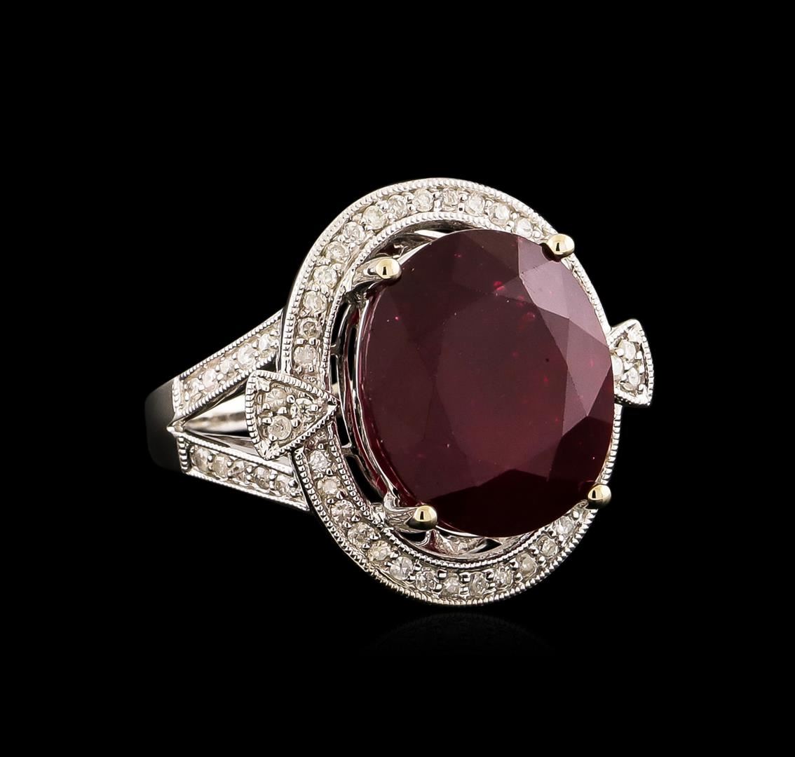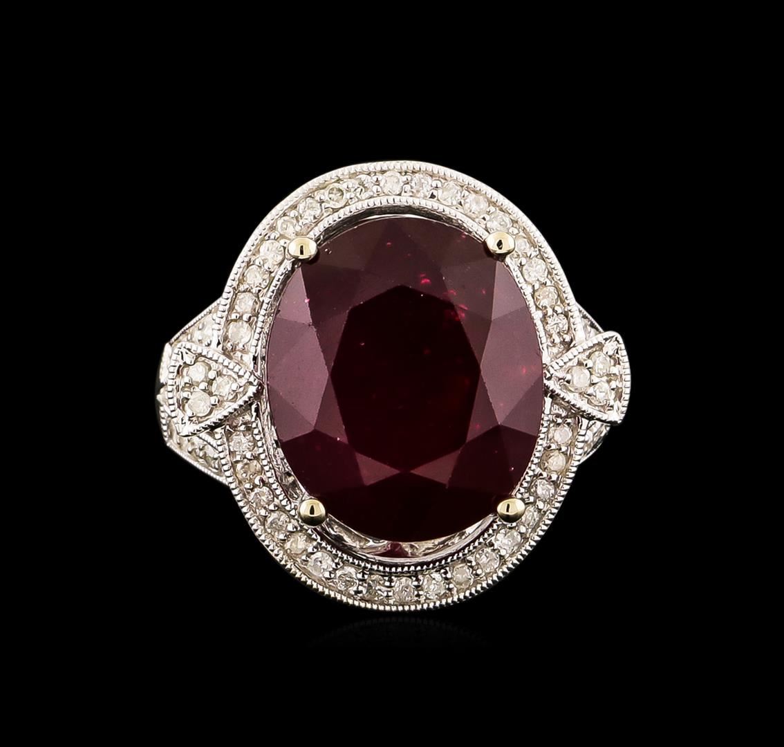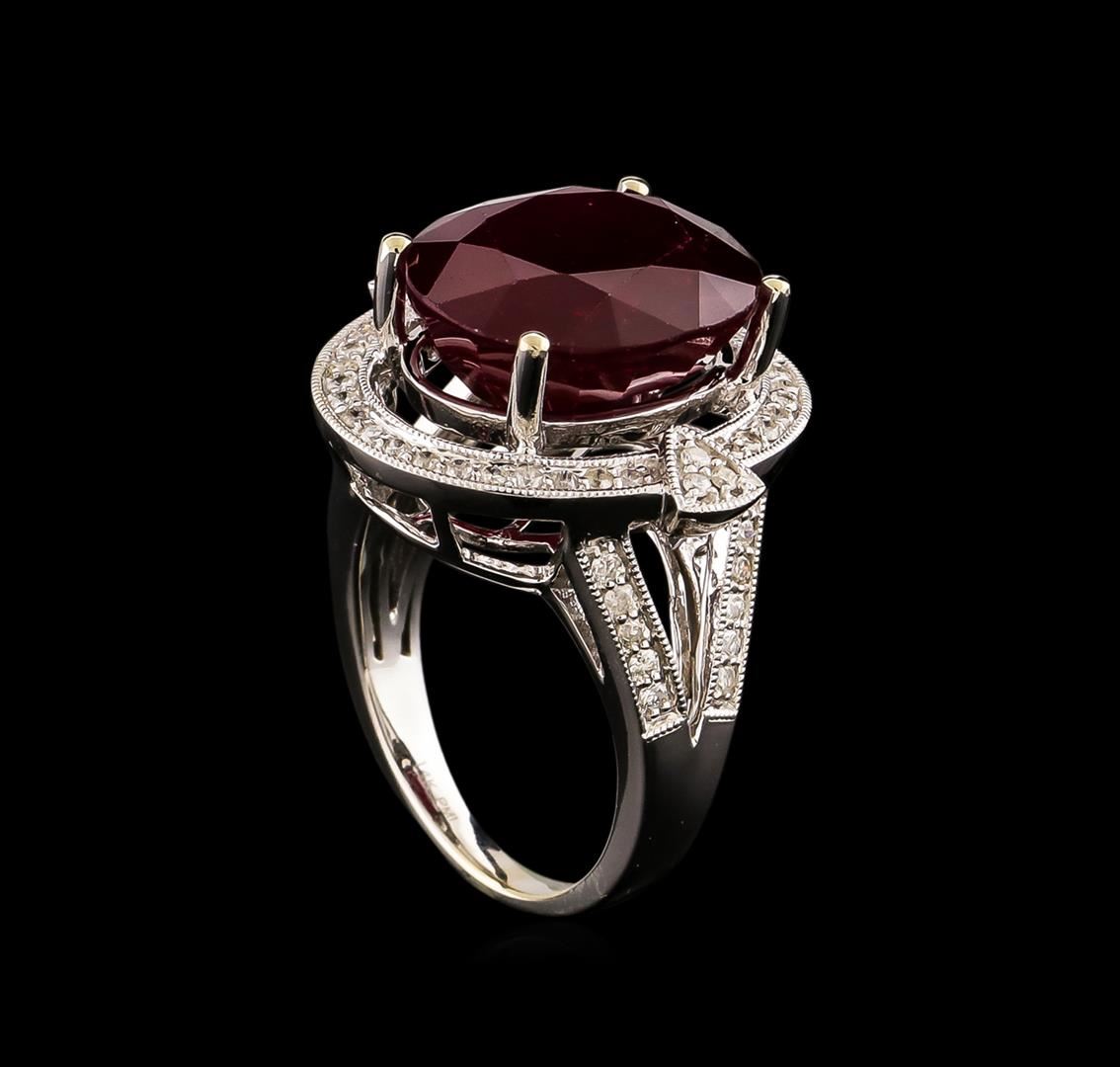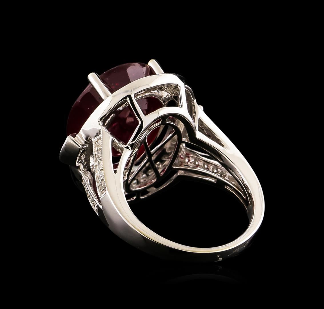 One electronically tested 14KT white gold ladies cast ruby and diamond ring. Condition is new, good workmanship. The featured ruby is set within a diamond bezel supported by diamond set split shoulders, completed by a one and one-half millimeter wide band. Bright polish finish with milgrain detailing throughout. Trademark is PMI. Identified with markings of "14K". Containing: One prong set oval mixed cut natural ruby, measuring 15.00 x 13.00 x 8.40mm, 10%. bulge factor, approximate weight of 14.49ct., clarity is heavily included, type II, dark, very slightly brownish, slightly purplish red color, (GIA slpR 7/3), cut is good. Transmitting light somewhat diffusely, transparent to translucent. Naturally occurring internal & external characteristics are present. Indications of laboratory high temperature heat treatment, with glass & flux additives. Graded in the setting. Ruby has a low tolerance to rhodium plating, repolishing the surface, & ultrasonic cleaning. Sixty bead set round brilliant cut diamonds, measuring 1.30 - 1.20 x 0.75mm (depth est.) approximate. Total Weight of 60 Stones = 0.52ct. Graded in the setting. Clarity: I-1 to I-3. Color: G - I. Total Weight of Colored Stones 14.49ct. Total Weight of Diamonds 0.52ct. Total Weight of Ring 10.14 grams. AIG Appraised at $5,635.00.