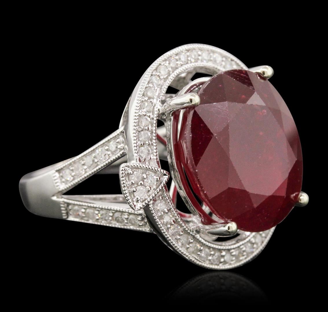 One electronically tested 14KT white gold ladies cast ruby and diamond ring. Condition is new, good workmanship. The featured ruby is set within a diamond bezel supported by diamond set split shoulders, completed by a one and one-half millimeter wide band. Bright polish finish with milgrain detailing throughout. Trademark is PMI. Identified with markings of "14K". Containing: One prong set oval mixed cut natural ruby, measuring 15.00 x 13.00 x 8.40mm, 10%. bulge factor, approximate weight of 14.49ct., clarity is heavily included, type II, dark, very slightly brownish, slightly purplish red color, (GIA slpR 7/3), cut is good. Transmitting light somewhat diffusely, transparent to translucent. Naturally occurring internal & external characteristics are present. Indications of laboratory high temperature heat treatment, with glass & flux additives. Graded in the setting. Ruby has a low tolerance to rhodium plating, repolishing the surface, & ultrasonic cleaning. Sixty bead set round brilliant cut diamonds, measuring 1.30 - 1.20 x 0.75mm (depth est.) approximate. Total Weight of 60 Stones = 0.52ct. Graded in the setting. Clarity: I-1 to I-3. Color: G - I. Total Weight of Colored Stones 14.49ct. Total Weight of Diamonds 0.52ct. Total Weight of Ring 10.14 grams. AIG Appraised at $5,635.00.