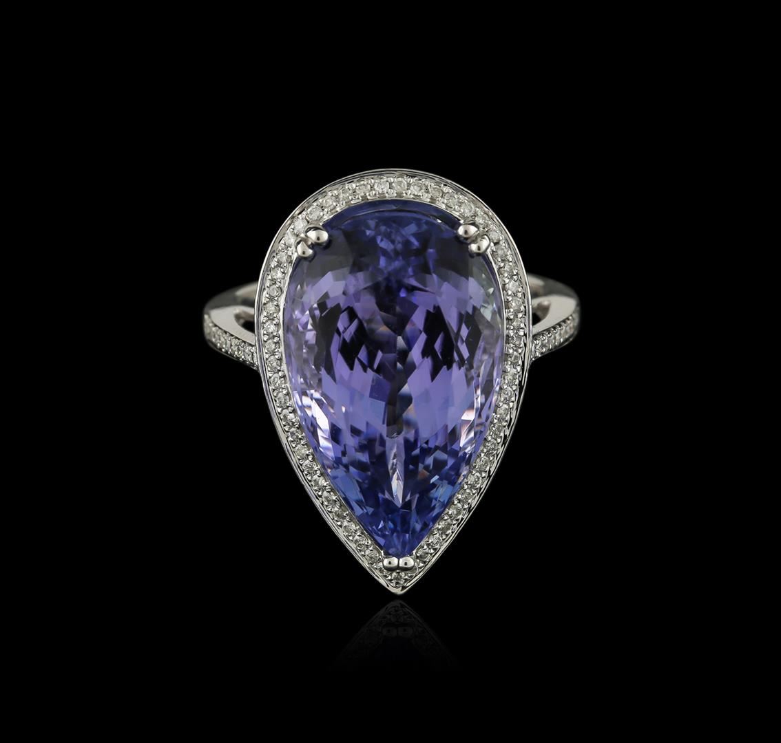 One electronically tested 14KT white gold ladies cast tanzanite and diamond ring with a bright polish finish. Identified with markings of "14K". Condition is new. Containing: One prong set pear modified brilliant cut natural tanzanite, measuring 19.00 x 12.00 x 9.50mm, approximate weight of 14.51ct., clarity is eye clean, type I, medium light, very slightly grayish, violet color, (GIA V 4/3), cut is good. Seventy-Six prong set round brilliant cut diamonds, measuring 1.00 - 1.00 x 0.60mm (depth est.) approximate total weight of 76 Stones = 0.20ct. Clarity: I-1 to I-2. Color: I - J, Cut is Good. Diamonds and colored gemstones are graded in the mounting, unless otherwise stated. Colored gemstones are presumed to have been subjected to commonly used enhancement processes.. Total Weight of Colored Stones 14.51ct. Total Weight of Diamonds 0.20ct. Total Weight of Ring 7.10 grams. GGL Appraised at $8,335.00.
