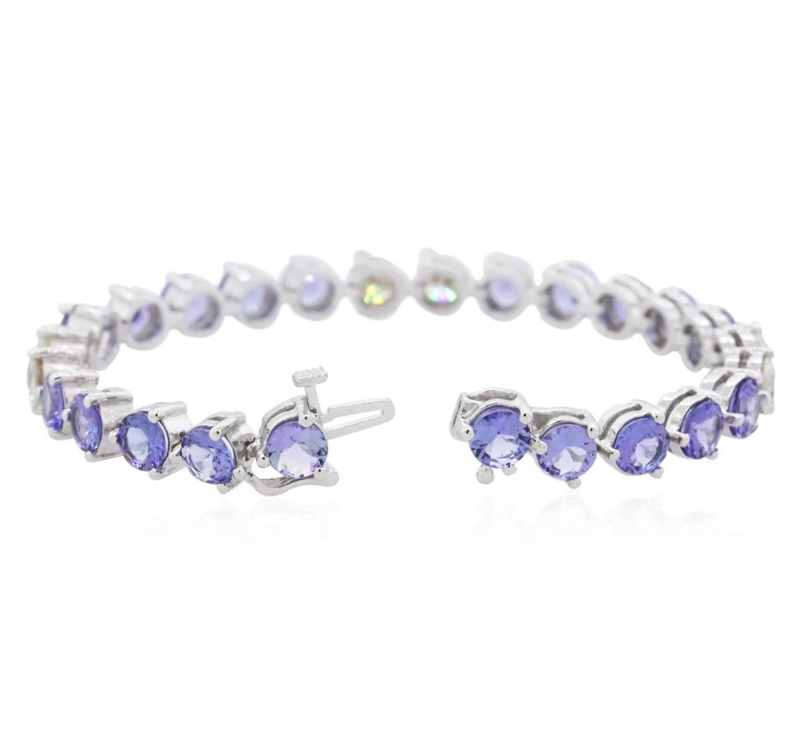 One electronically tested 14KT white gold ladies combination cast & assembled tanzanite and diamond bracelet with a hidden box clasp with a bright polish finish. Measurements: 7" in length. Condition is new. Containing: Twenty prong set round modified brilliant cut natural tanzanites, measuring 5.50 - 5.50 x 3.58 mm, approximate total weight of 14.60ct., clarity is eye clean, type I, medium light, very slightly grayish, violet color, (GIA V 4/3), cut is good. Six prong set round brilliant cut diamonds, measuring 5.50 - 5.50 x 3.30mm (depth est.) approximate total weight of 6 Stones = 3.65ct. Clarity: I-1 to I-2. Color: K - L, Cut is Good. Colored gemstones are presumed to have been subjected to commonly used enhancement processes. All diamonds and colored gemstones are graded in the mounting, unless otherwise stated. Total Weight of Colored Stones 14.60ct. Total Weight of Diamonds 3.65ct. Total Weight of Bracelet 20.30 grams. GGL Appraised.