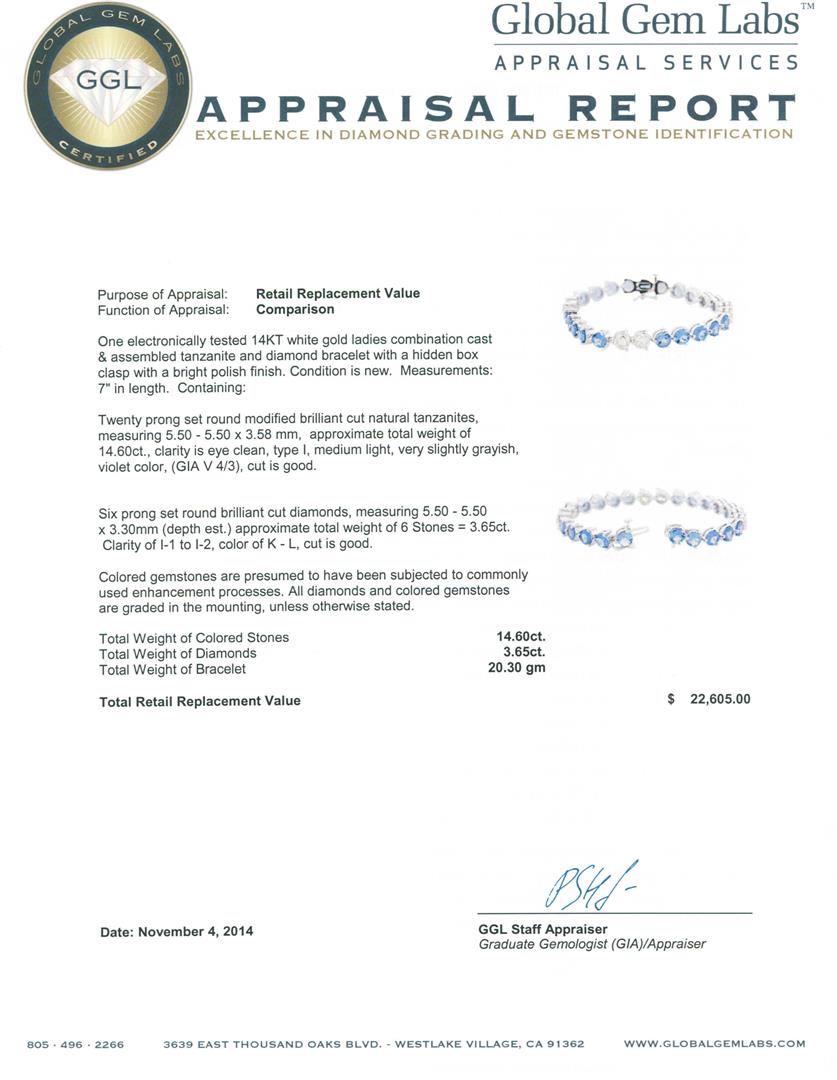 One electronically tested 14KT white gold ladies combination cast & assembled tanzanite and diamond bracelet with a hidden box clasp with a bright polish finish. Measurements: 7" in length. Condition is new. Containing: Twenty prong set round modified brilliant cut natural tanzanites, measuring 5.50 - 5.50 x 3.58 mm, approximate total weight of 14.60 ct., clarity is eye clean, type I, medium light, very slightly grayish, violet color, (GIA V 4/3), cut is good. Six prong set round brilliant cut diamonds, measuring 5.50 - 5.50 x 3.30mm (depth est.) approximate total weight of 6 Stones = 3.65ct. Clarity: I-1 to I-2. Color: K - L, Cut is Good. Colored gemstones are presumed to have been subjected to commonly used enhancement processes. All diamonds and colored gemstones are graded in the mounting, unless otherwise stated. Total Weight of Colored Stones 14.60 ct. Total Weight of Diamonds 3.65ct. Total Weight of Bracelet 20.30 grams. GGL Appraised.