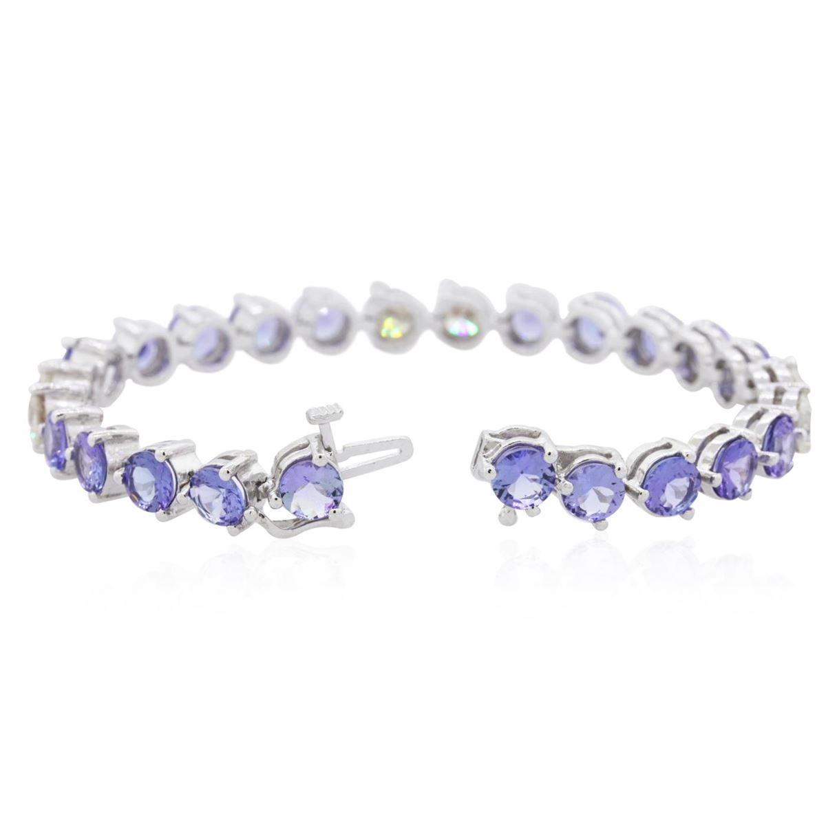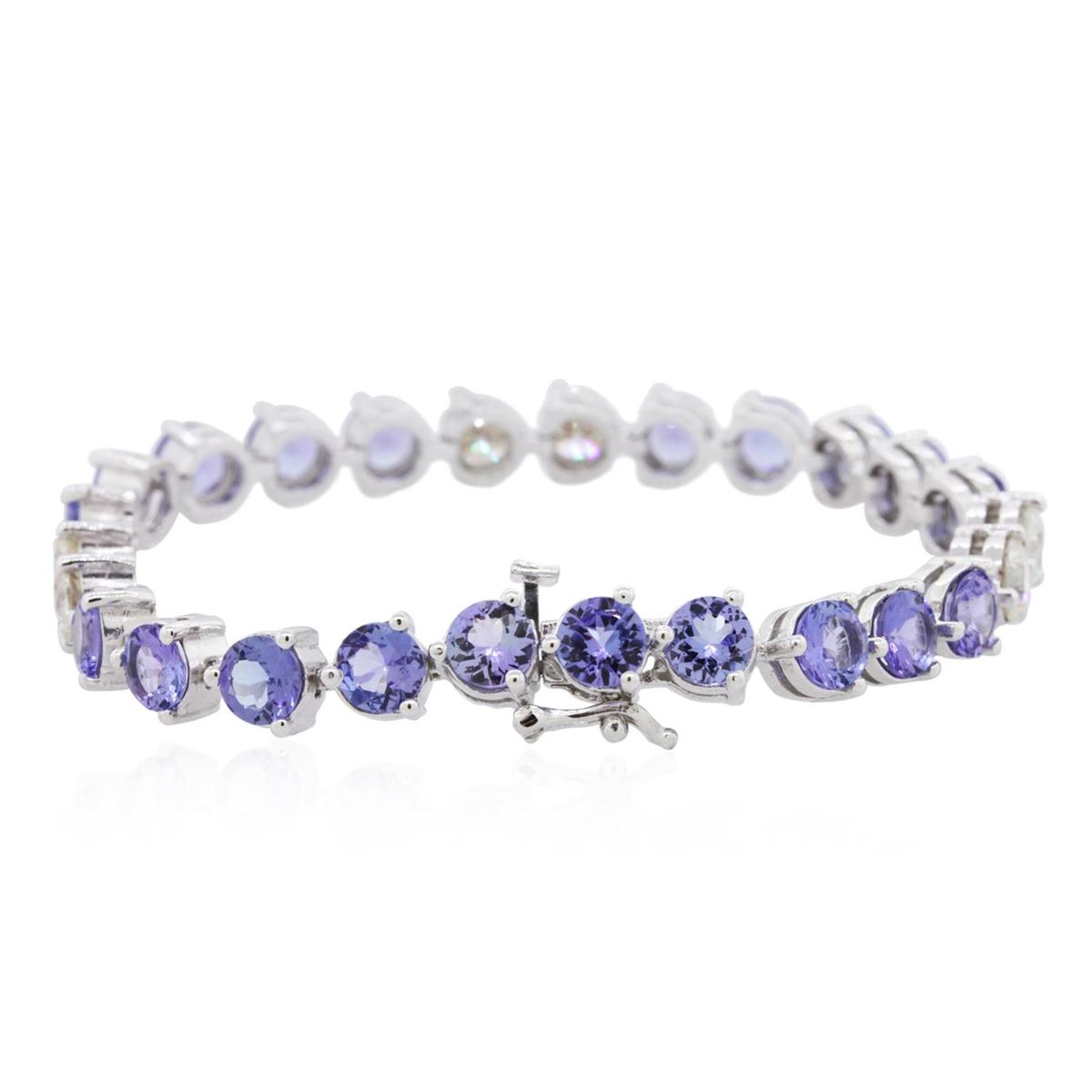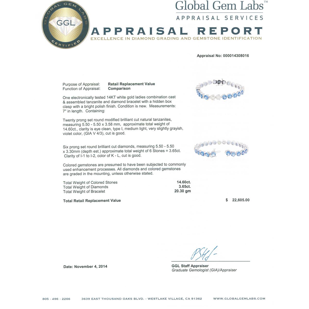 One electronically tested 14KT white gold ladies combination cast & assembled tanzanite and diamond bracelet with a hidden box clasp with a bright polish finish. Measurements: 7" in length. Condition is new. Containing: Twenty prong set round modified brilliant cut natural tanzanites, measuring 5.50 - 5.50 x 3.58 mm, approximate total weight of 14.60ct., clarity is eye clean, type I, medium light, very slightly grayish, violet color, (GIA V 4/3), cut is good. Six prong set round brilliant cut diamonds, measuring 5.50 - 5.50 x 3.30mm (depth est.) approximate total weight of 6 Stones = 3.65ct. Clarity: I-1 to I-2. Color: K - L, Cut is Good. Colored gemstones are presumed to have been subjected to commonly used enhancement processes. All diamonds and colored gemstones are graded in the mounting, unless otherwise stated. Total Weight of Colored Stones 14.60ct. Total Weight of Diamonds 3.65ct. Total Weight of Bracelet 20.30 grams. GGL Appraised at $22,605.00.