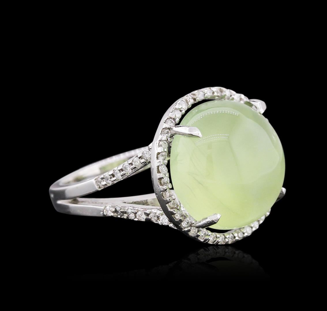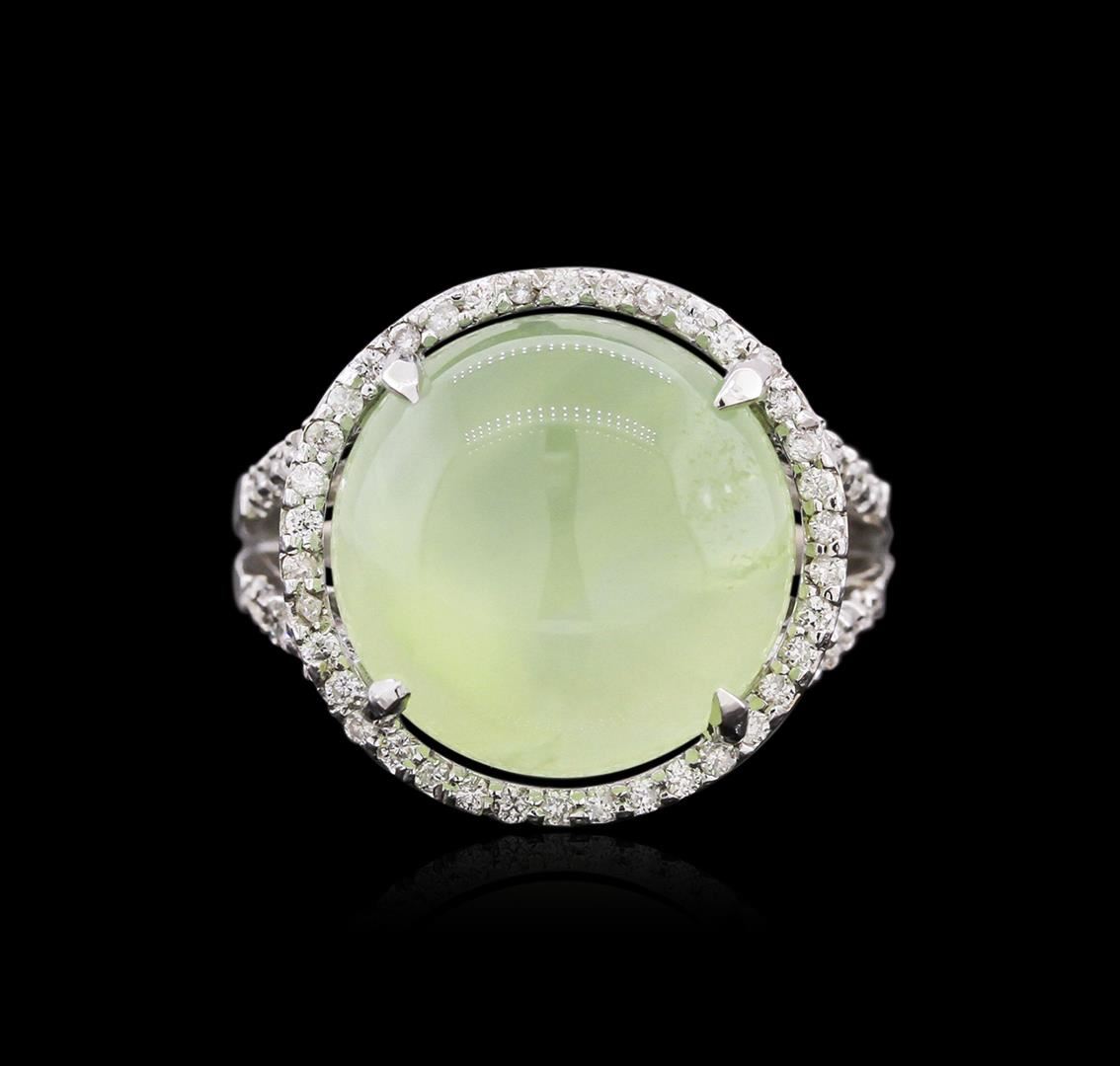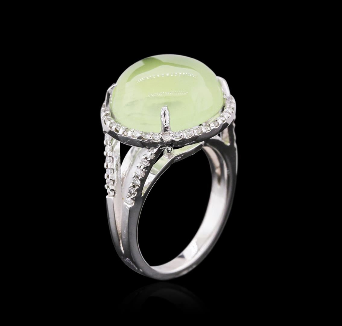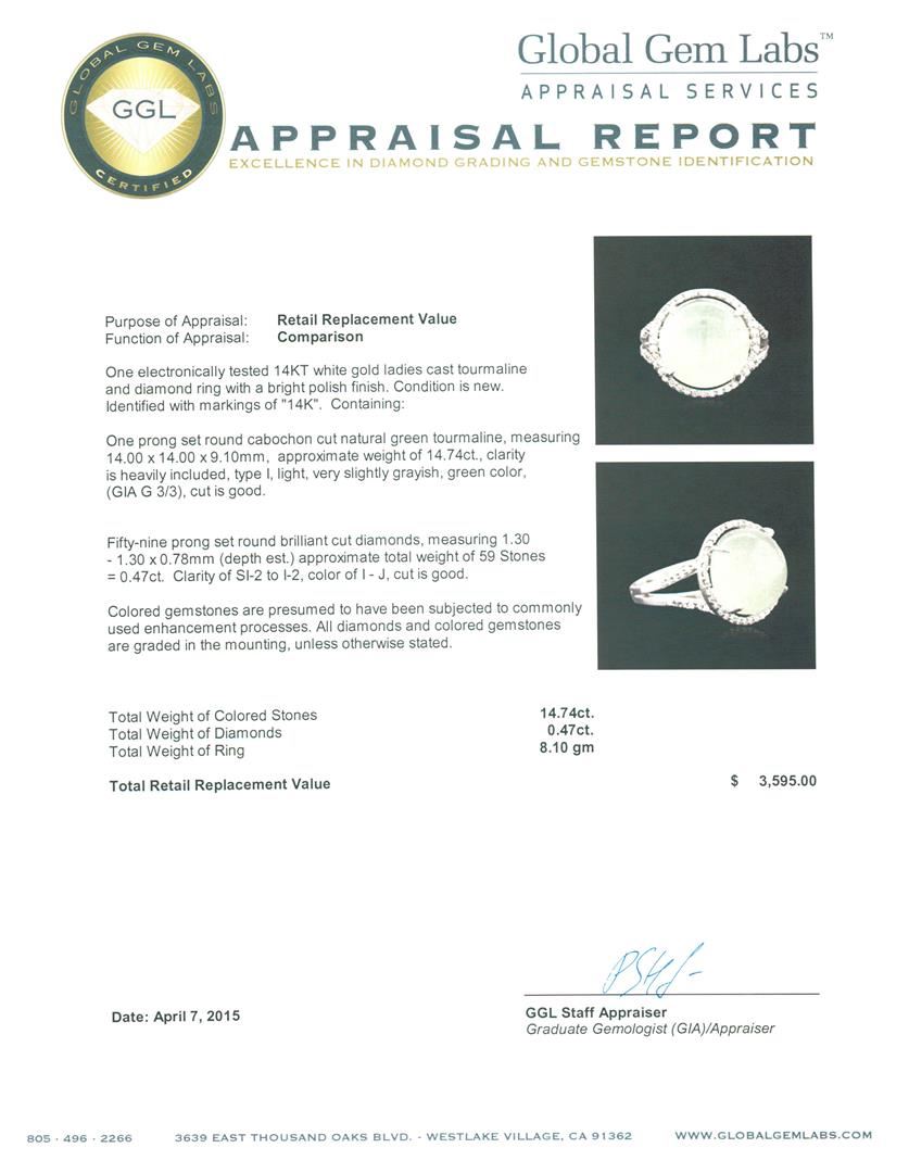 One electronically tested 14KT white gold ladies cast tourmaline and diamond ring with a bright polish finish. Identified with markings of "14K". Condition is new. Containing: One prong set round cabochon cut natural green tourmaline, measuring 14.00. x 14.00. x 9.10mm, approximate weight of 14.74ct., clarity is heavily included, type I, light, very slightly grayish, green color, (GIA G 3/3), cut is good. Fifty-Nine prong set round brilliant cut diamonds, measuring 1.30 - 1.30 x 0.78mm (depth est.) approximate total weight of 59 Stones = 0.47ct. Clarity: SI-2 to I-2. Color: I - J, Cut is Good. Colored gemstones are presumed to have been subjected to commonly used enhancement processes. All diamonds and colored gemstones are graded in the mounting, unless otherwise stated. Total Weight of Colored Stones 14.74ct. Total Weight of Diamonds 0.47ct. Total Weight of Ring 8.10 grams. GGL Appraised at $3,595.00.