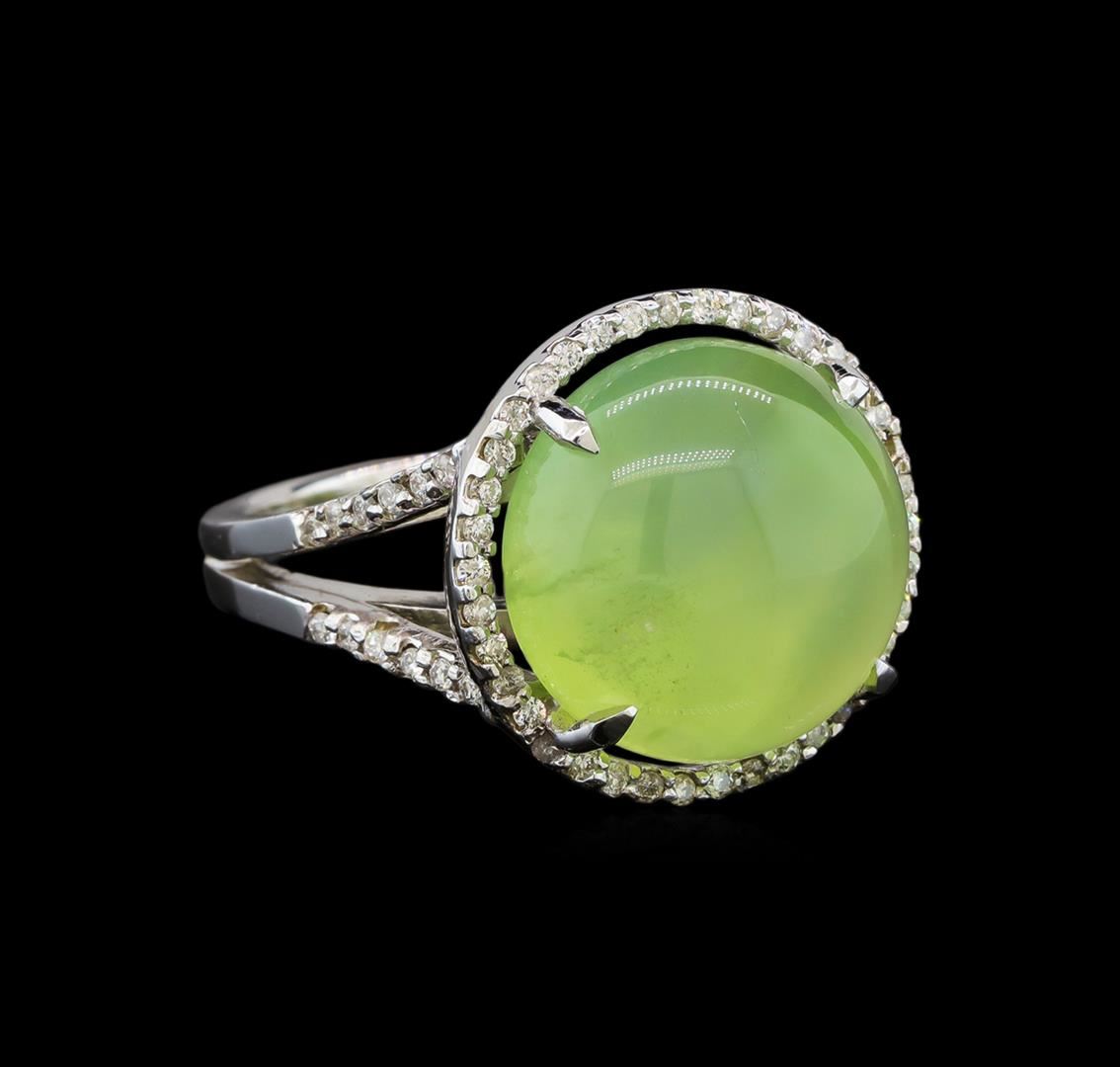 One electronically tested 14KT white gold ladies cast tourmaline and diamond ring with a bright polish finish. Identified with markings of "14K". Condition is new. Containing: One prong set round cabochon cut natural green tourmaline, measuring 14.00. x 14.00. x 9.10mm, approximate weight of 14.74ct., clarity is heavily included, type I, light, very slightly grayish, green color, (GIA G 3/3), cut is good. Fifty-Nine prong set round brilliant cut diamonds, measuring 1.30 - 1.30 x 0.78mm (depth est.) approximate total weight of 59 Stones = 0.47ct. Clarity: SI-2 to I-2. Color: I - J, Cut is Good. Colored gemstones are presumed to have been subjected to commonly used enhancement processes. All diamonds and colored gemstones are graded in the mounting, unless otherwise stated. Total Weight of Colored Stones 14.74ct. Total Weight of Diamonds 0.47ct. Total Weight of Ring 8.10 grams. GGL Appraised at $3,595.00.