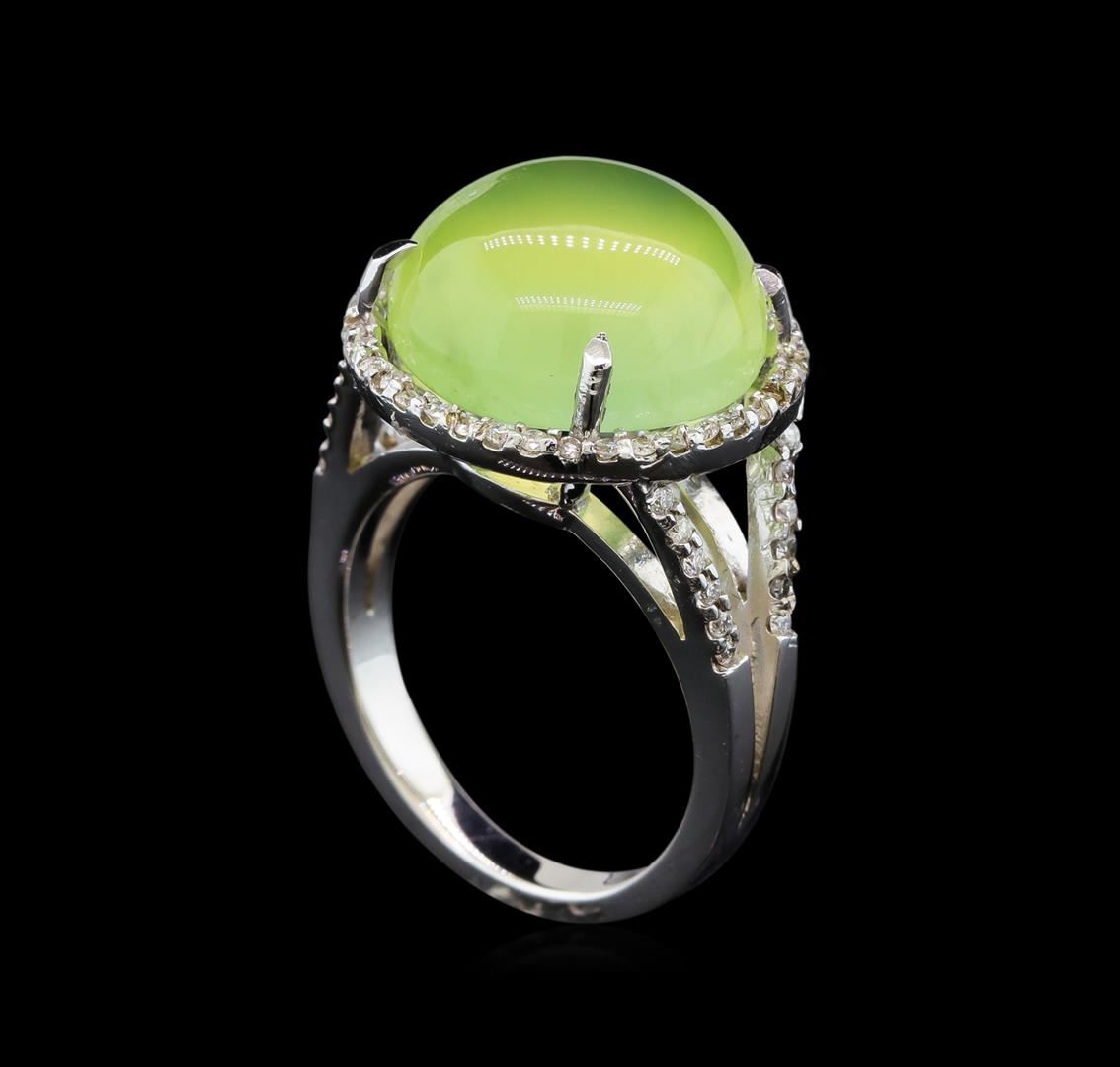 One electronically tested 14KT white gold ladies cast tourmaline and diamond ring with a bright polish finish. Identified with markings of "14K". Condition is new. Containing: One prong set round cabochon cut natural green tourmaline, measuring 14.00. x 14.00. x 9.10mm, approximate weight of 14.74ct., clarity is heavily included, type I, light, very slightly grayish, green color, (GIA G 3/3), cut is good. Fifty-Nine prong set round brilliant cut diamonds, measuring 1.30 - 1.30 x 0.78mm (depth est.) approximate total weight of 59 Stones = 0.47ct. Clarity: SI-2 to I-2. Color: I - J, Cut is Good. Colored gemstones are presumed to have been subjected to commonly used enhancement processes. All diamonds and colored gemstones are graded in the mounting, unless otherwise stated. Total Weight of Colored Stones 14.74ct. Total Weight of Diamonds 0.47ct. Total Weight of Ring 8.10 grams. GGL Appraised at $3,595.00.