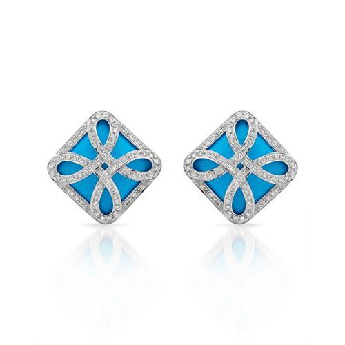 One 14KT White Gold 15.14ctw Turquoise and Diamond Earrings. (2) Turquoise stones with a total weight of 15.14cts. (176) round Diamonds with a total weight of 0.83cts with a color of I and clarity of I-1. Total weight of these earrings are 8.56 grams.
