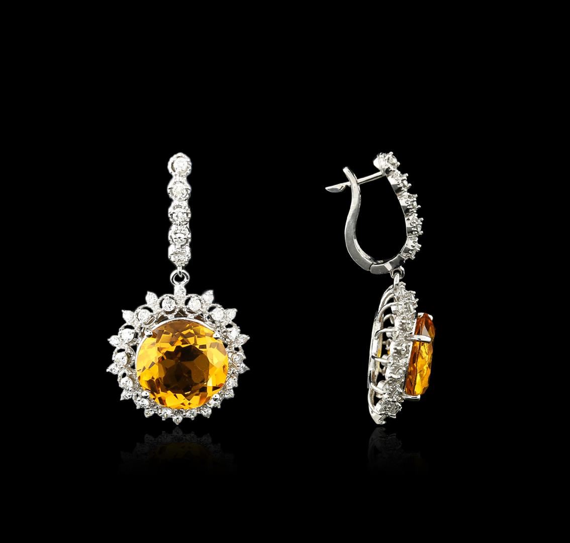 One pair electronically tested 14KT white gold ladies cast citrine and diamond earrings with hinged clip backs with a bright polish finish. Identified with markings of "14K". Condition is new. Containing: Two prong set oval round modified brilliant cut natural citrine quartzes, measuring 13.00 - 13.00 x 8.45 mm, approximate total weight of 15.20ct., clarity is eye clean, type I, medium light, brownish, orangy yellow color, (GIA oY 4/3), cut is good. Sixty-Six prong set round brilliant cut diamonds, measuring 1.70 - 1.50 x 0.96mm (depth est.) approximate total weight of 66 Stones = 0.98ct. Clarity: SI-1 to I-1. Color: H - I, Cut is Good. Diamonds and colored gemstones are graded in the mounting, unless otherwise stated. Colored gemstones are presumed to have been subjected to commonly used enhancement processes. Total Weight of Colored Stones 15.20ct. Total Weight of Diamonds 0.98ct. Total Weight of Earrings 11.90 grams. GGL Appraised at $3,550.00.