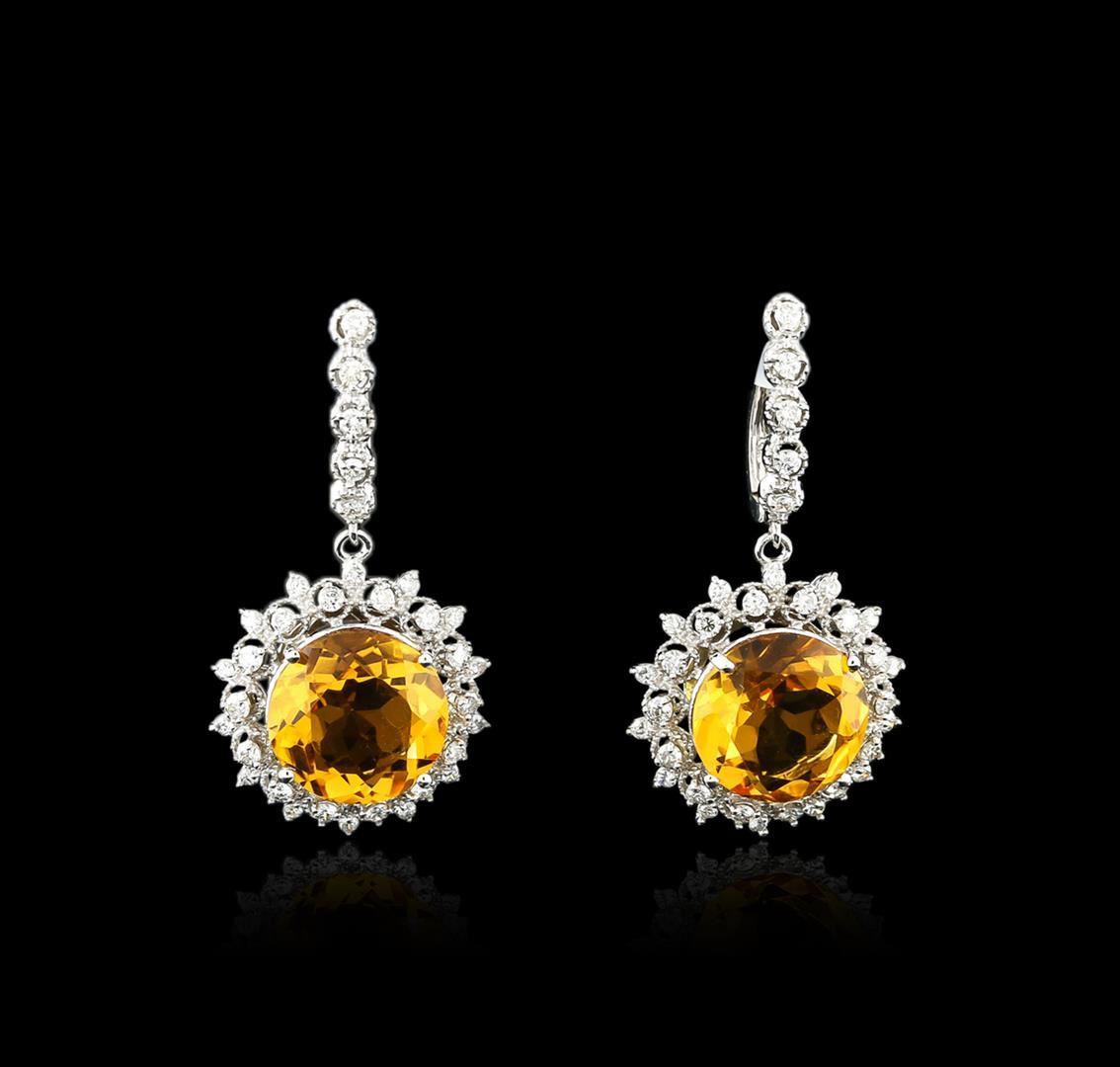One pair electronically tested 14KT white gold ladies cast citrine and diamond earrings with hinged clip backs with a bright polish finish. Identified with markings of "14K". Condition is new. Containing: Two prong set oval round modified brilliant cut natural citrine quartzes, measuring 13.00 - 13.00 x 8.45 mm, approximate total weight of 15.20 ct., clarity is eye clean, type I, medium light, brownish, orangy yellow color, (GIA oY 4/3), cut is good. Sixty-Six prong set round brilliant cut diamonds, measuring 1.70 - 1.50 x 0.96mm (depth est.) approximate total weight of 66 Stones = 0.98ct. Clarity: SI-1 to I-1. Color: H - I, Cut is Good. Diamonds and colored gemstones are graded in the mounting, unless otherwise stated. Colored gemstones are presumed to have been subjected to commonly used enhancement processes. Total Weight of Colored Stones 15.20 ct. Total Weight of Diamonds 0.98ct. Total Weight of Earrings 11.90 grams. GGL Appraised.