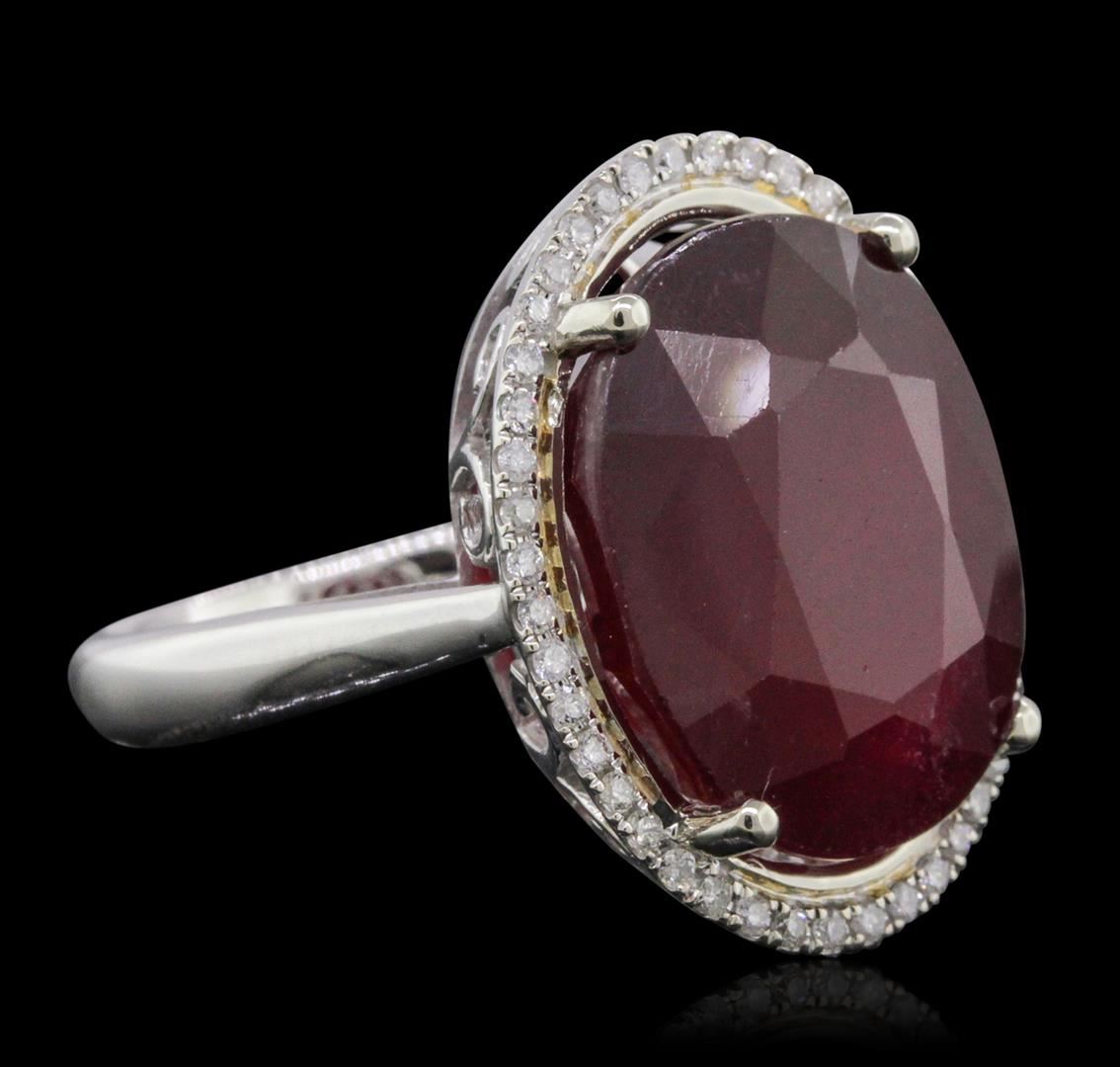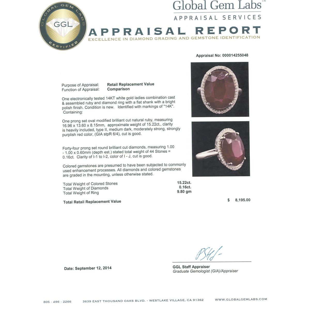 One electronically tested 14KT white gold ladies combination cast & assembled ruby and diamond ring with a flat shank with a bright polish finish. Identified with markings of "14K". Condition is new. Containing: One prong set oval modified brilliant cut natural ruby, measuring 16.96 x 13.60 x 8.15mm, approximate weight of 15.22ct., clarity is heavily included, type II, medium dark, moderately strong, strongly purplish red color, (GIA stpR 6/4), cut is good. Forty-Four prong set round brilliant cut diamonds, measuring 1.00 - 1.00 x 0.60mm (depth est.) stated total weight of 44 Stones = 0.16ct. Clarity: I-1 to I-2. Color: I - J, Cut is Good. Colored gemstones are presumed to have been subjected to commonly used enhancement processes. All diamonds and colored gemstones are graded in the mounting, unless otherwise stated total weight of Colored Stones 15.22ct. Total Weight of Diamonds 0.16ct. Total Weight of Ring 9.80 grams. GGL Appraised at $8,195.00.