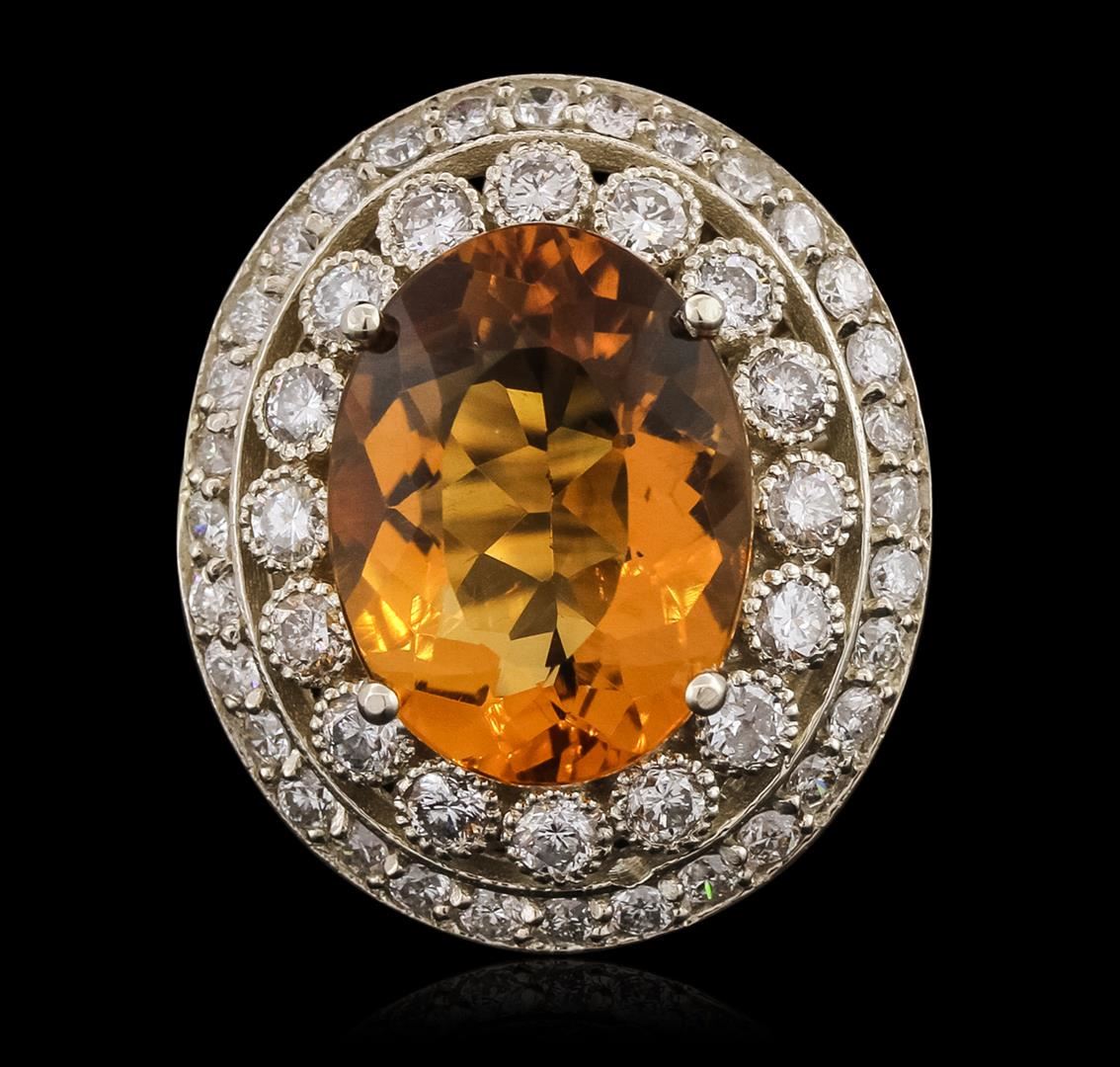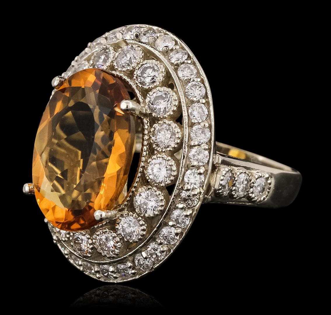 One electronically tested 14KT white gold ladies combination cast & assembled engagement ring with a bright polish finish. Identified with markings of "14K". Condition is new. Containing: One prong set oval modified brilliant cut natural citrine quartz, measuring 26.00 x 12.20 x 7.93mm, approximate weight of 15.39ct., clarity is eye clean, type I, medium light, brownish, orangy yellow color, (GIA oY 4/3), cut is good. Fifty prong set round brilliant cut diamonds, measuring 2.50 - 1.90 x 1.32mm (depth est.) approximate total weight of 50 Stones = 1.95ct. Clarity: SI-2 to I-1. Color: I - J, Cut is Good. Colored gemstones are presumed to have been subjected to commonly used enhancement processes. All diamonds and colored gemstones are graded in the mounting, unless otherwise stated. Total Weight of Colored Stones 15.39ct. Total Weight of Diamonds 1.95ct. Total Weight of Ring 12.00 grams. GGL Appraised at $7,970.00.