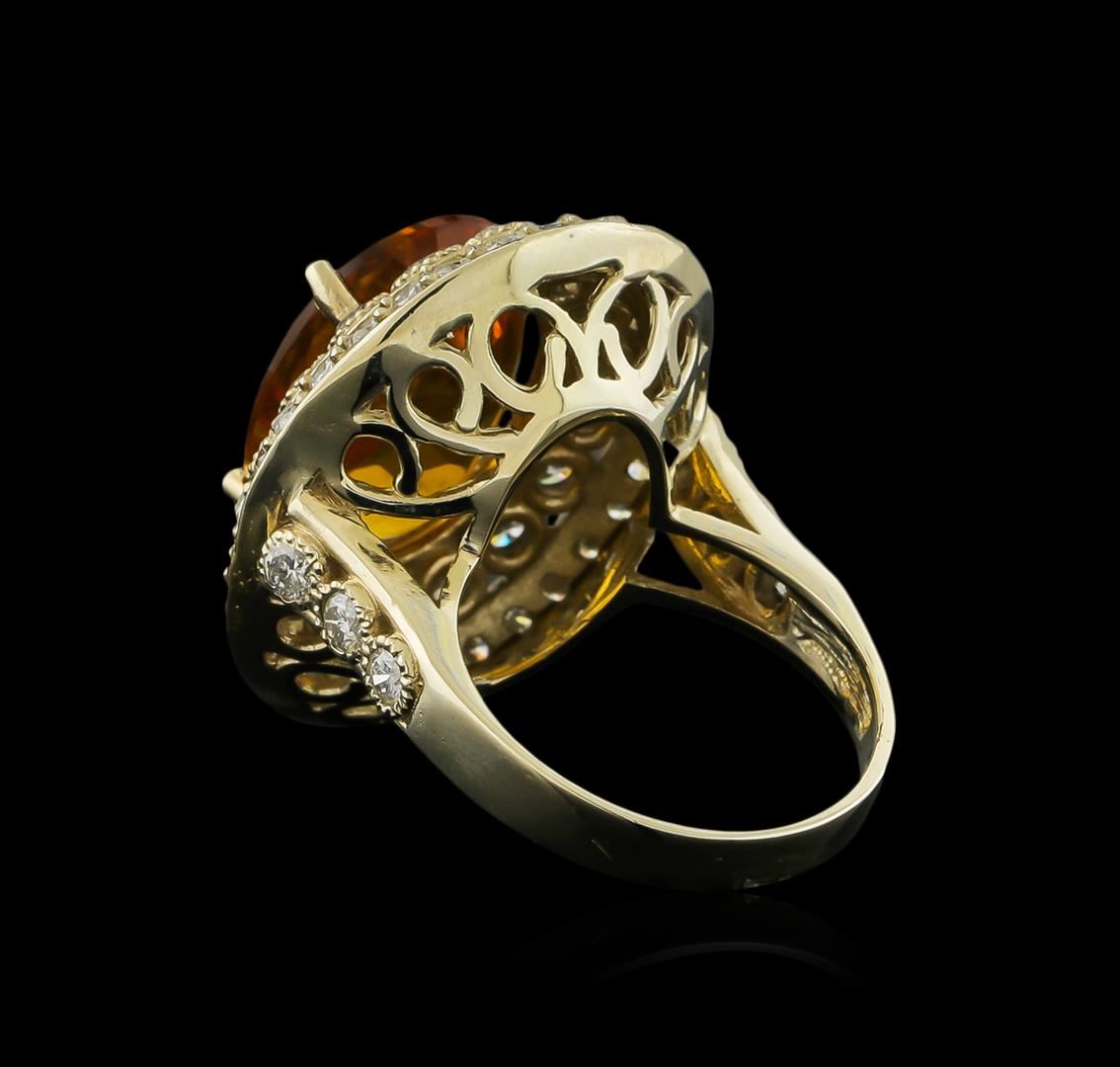 One electronically tested 14KT white gold ladies combination cast & assembled engagement ring with a bright polish finish. Identified with markings of "14K". Condition is new. Containing: One prong set oval modified brilliant cut natural citrine quartz, measuring 26.00 x 12.20 x 7.93mm, approximate weight of 15.39ct., clarity is eye clean, type I, medium light, brownish, orangy yellow color, (GIA oY 4/3), cut is good. Fifty prong set round brilliant cut diamonds, measuring 2.50 - 1.90 x 1.32mm (depth est.) approximate total weight of 50 Stones = 1.95ct. Clarity: SI-2 to I-1. Color: I - J, Cut is Good. Colored gemstones are presumed to have been subjected to commonly used enhancement processes. All diamonds and colored gemstones are graded in the mounting, unless otherwise stated. Total Weight of Colored Stones 15.39ct. Total Weight of Diamonds 1.95ct. Total Weight of Ring 12.00 grams. GGL Appraised at $7,970.00.