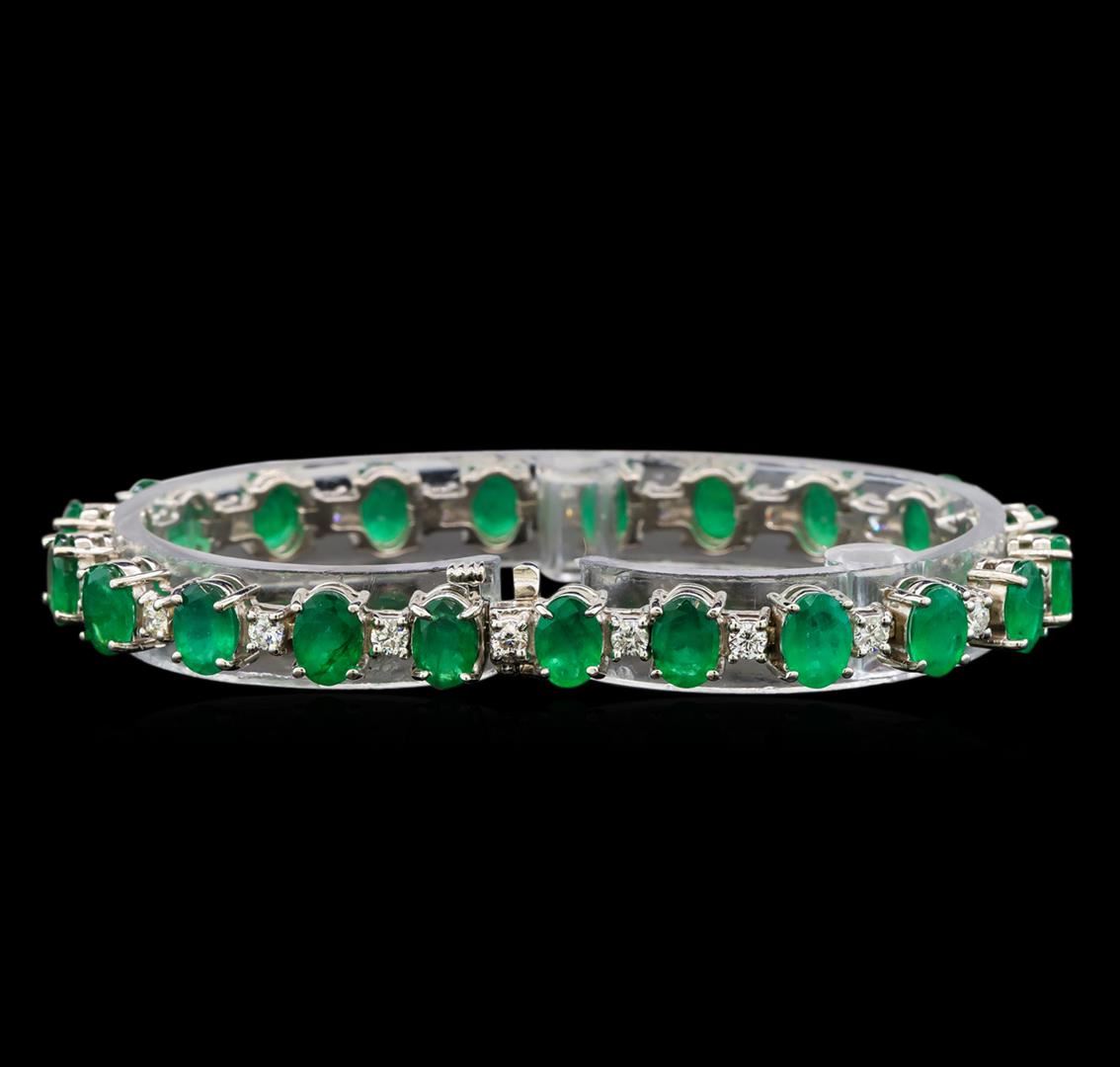 One electronically tested 14KT white gold ladies cast emerald and diamond bracelet with a hidden box clasp with a bright polish finish. Measurements: 7 inches in length. Identified with markings of "14K". Condition is new. Containing: Twenty-one prong set oval modified brilliant cut natural emeralds, measuring 6.80 x 5.00. x 3.25mm, approximate total weight of 15.83ct., clarity is moderately included, type III, medium, moderately strong, green color, (GIA G 5/4), cut is good. Twenty-One prong set round brilliant cut diamonds, measuring 2.50 - 2.50 x 1.50mm (depth est.) approximate total weight of 21 Stones = 1.52ct. Clarity: SI-1 to I-1. Color: I - J, Cut is Good. Colored gemstones are presumed to have been subjected to commonly used enhancement processes. All diamonds and colored gemstones are graded in the mounting, unless otherwise stated. Total Weight of Colored Stones 15.83ct. Total Weight of Diamonds 1.52ct. Total Weight of Bracelet 18.60 grams. GGL Appraised at $8,255.00.