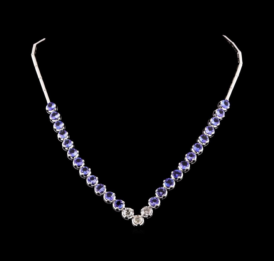 One electronically tested 14KT white gold ladies combination cast & assembled tanzanite and diamond necklace with a hidden box clasp with safety closer with a bright polish finish. Identified with markings of "14K". Condition is new. Containing: Twenty-four prong set round modified brilliant cut natural tanzanites, measuring 5.46 - 5.38 x 3.35 mm, approximate total weight of 16.08ct., clarity is eye clean, type I, medium light, very slightly grayish, violet color, (GIA V 4/3), cut is good. Three prong set round brilliant cut diamonds, measuring 5.50 - 5.15 x 3.20mm (depth est.) approximate total weight of 3 Stones = 1.66ct. Clarity: I-1 to I-2. Color: K - L, Cut is Good. All diamonds and colored gemstones are graded in the mounting, unless otherwise stated. Colored gemstones are presumed to have been subjected to commonly used enhancement processes. Total Weight of Colored Stones 16.08ct. Total Weight of Diamonds 1.66ct. Total Weight of Necklace 34.19 grams. GGL Appraised at $13,020.00.