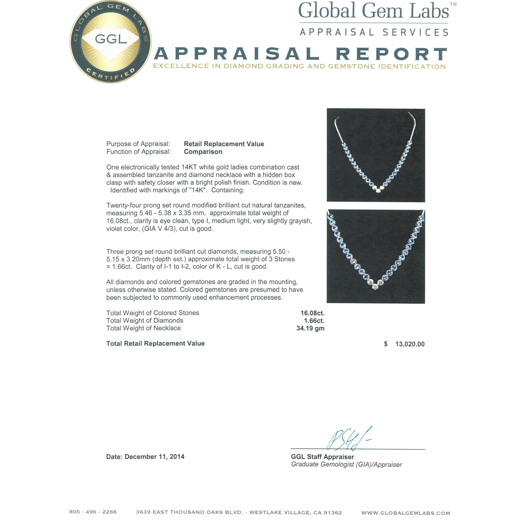 One electronically tested 14KT white gold ladies combination cast & assembled tanzanite and diamond necklace with a hidden box clasp with safety closer with a bright polish finish. Identified with markings of "14K". Condition is new. Containing: Twenty-four prong set round modified brilliant cut natural tanzanites, measuring 5.46 - 5.38 x 3.35 mm, approximate total weight of 16.08ct., clarity is eye clean, type I, medium light, very slightly grayish, violet color, (GIA V 4/3), cut is good. Three prong set round brilliant cut diamonds, measuring 5.50 - 5.15 x 3.20mm (depth est.) approximate total weight of 3 Stones = 1.66ct. Clarity: I-1 to I-2. Color: K - L, Cut is Good. All diamonds and colored gemstones are graded in the mounting, unless otherwise stated. Colored gemstones are presumed to have been subjected to commonly used enhancement processes. Total Weight of Colored Stones 16.08ct. Total Weight of Diamonds 1.66ct. Total Weight of Necklace 34.19 grams. GGL Appraised at $13,020.00.