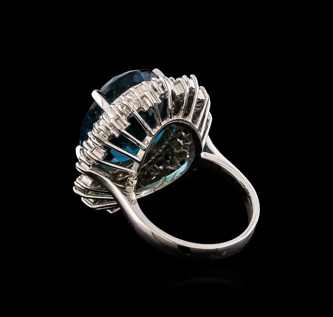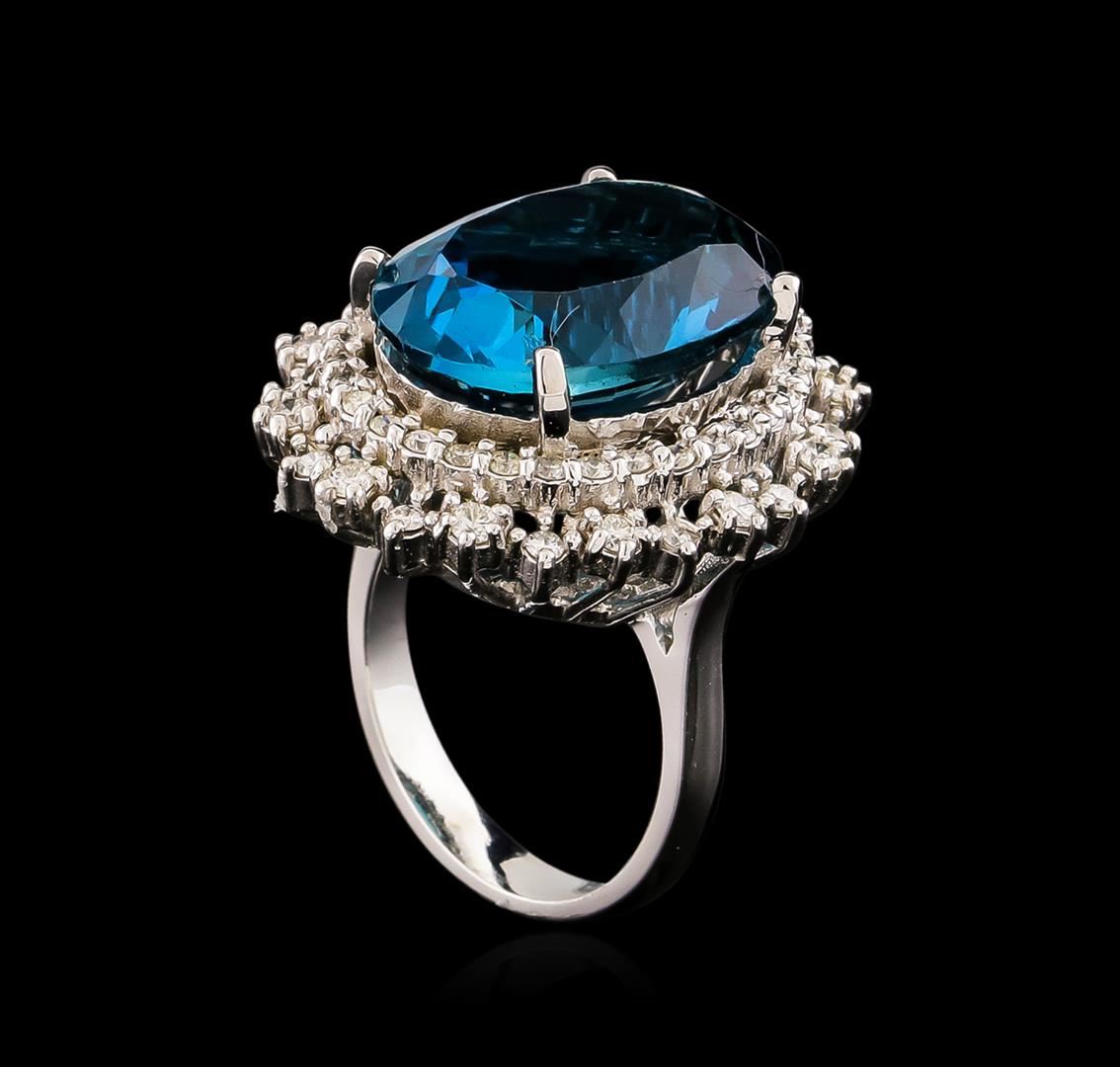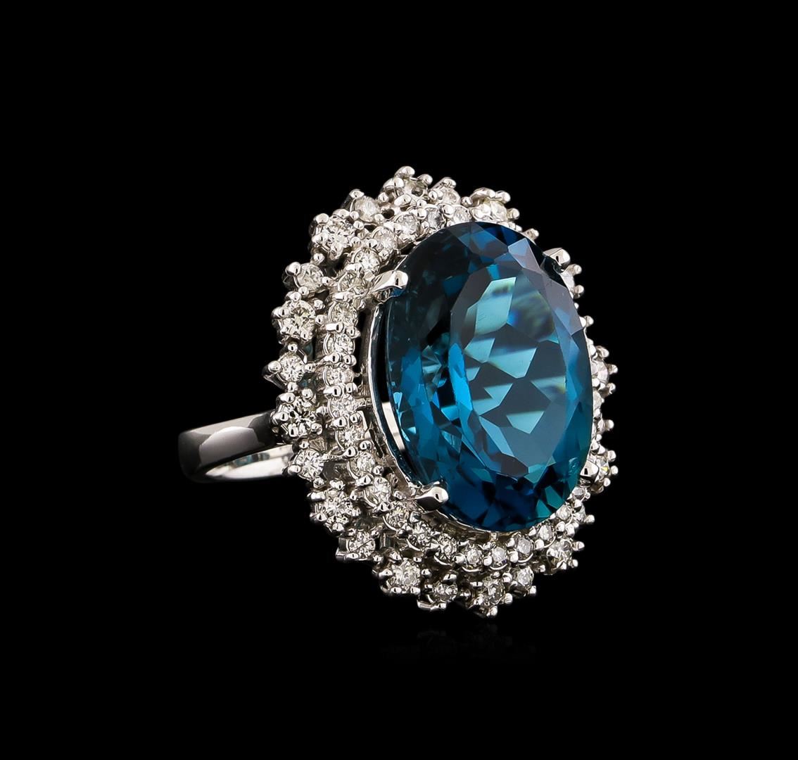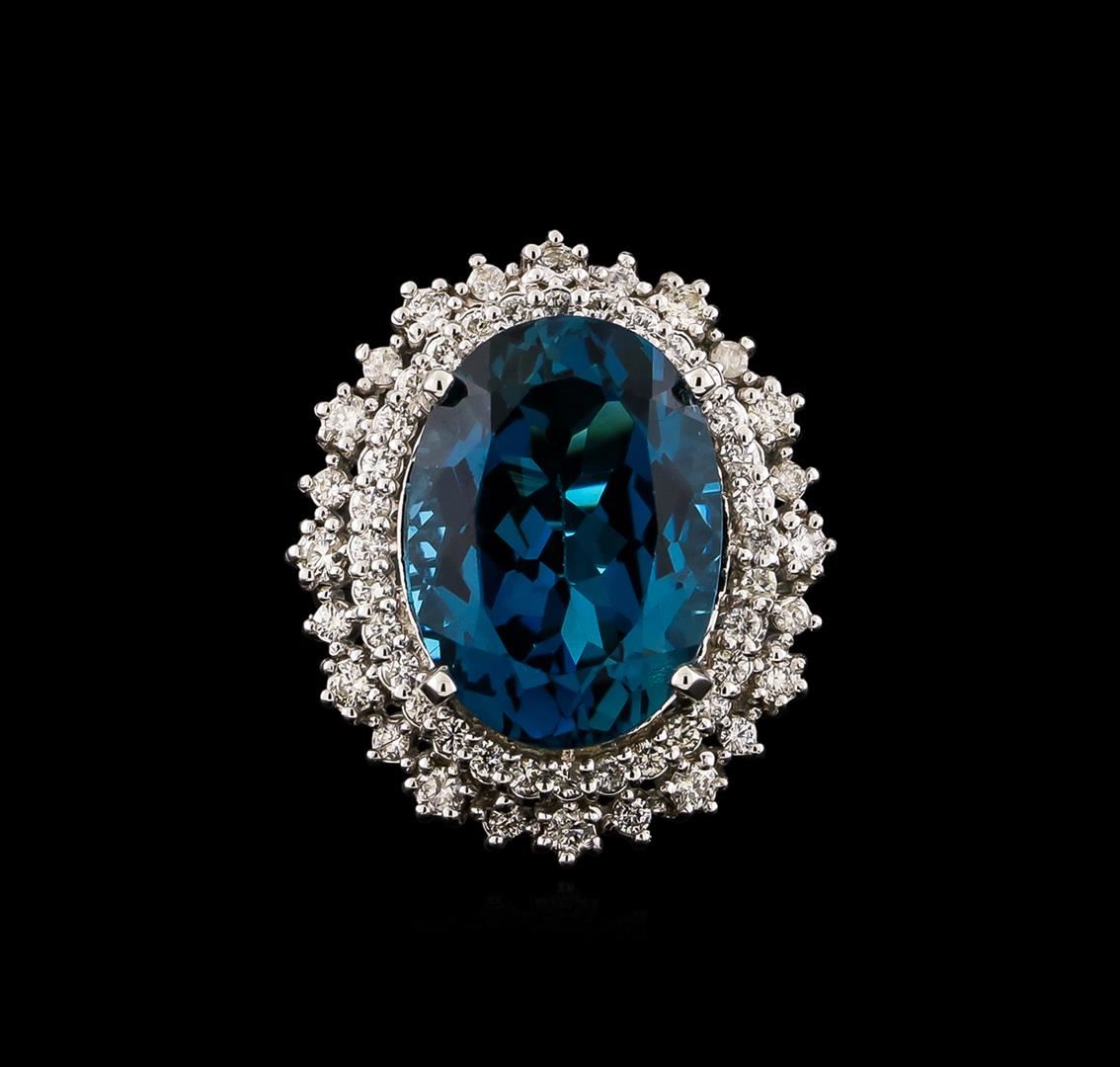 One electronically tested 14KT white gold Ladies combination cast & assembled ring with a high polish finish. Condition is new. Identified with markings of "K14". Containing: One prong set oval modified mixed cut natural blue topaz, measuring 18.00 x 13.00 x 9.00mm, approximate weight of 16.09ct., clarity is eye clean, type I, medium, moderately strong, blue color, (GIA B 5/4), cut is very good. Colored gemstones are presumed to have been subjected to commonly used color/clarity enhancement processes. Twelve prong set round brilliant cut diamonds, measuring 1.90 - 1.90 x 1.14mm (depth est.) approximate. Total Weight of 12 Stones = 0.33ct. Clarity: SI-1 to SI-2. Color: H - I, Cut is Good. Forty-Four prong set round brilliant cut diamonds, measuring 1.50 - 1.50 x 0.90mm (depth est.) approximate. Total Weight of 44 Stones = 0.65ct. Clarity: SI-1 to SI-2. Color: H - I, Cut is Good. Total Weight of Colored Stones 16.09ct. Total Weight of Diamonds 0.98ct. Total Weight of Ring 12.80 grams. GGL Appraised at $7,550.00.