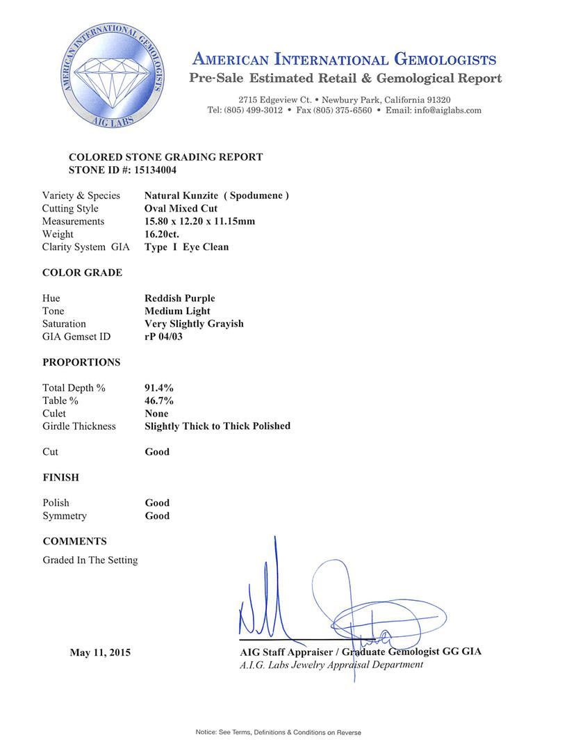One electronically tested 14KT white gold ladies cast kunzite and diamond ring with a bright polish finish. The featured kunzite is set within a diamond bezel, completed by a three and one-half millimeter wide band. Identified with markings of "14K". Condition is new, good workmanship. Containing: One prong set oval mixed cut natural kunzite, measuring 15.80 x 12.20 x 11.15mm, 15% bulge factor, approximate weight of 16.20ct., clarity is eye clean, type I, medium light, very slightly grayish, reddish purple color, (GIA rP 4/3), cut is good. Transmitting light with no distortion, transparent. Colored Stone Grading Report attached. Graded in the setting. Twenty-Two channel set round brilliant cut diamonds, measuring 2.20 - 2.10 x 1.29mm (depth est.) approximate total weight of 22 Stones = 0.90ct. Graded in the setting. Clarity: SI-1 to SI-2. Color: H - J. Total Weight of Colored Stones 16.20ct. Total Weight of Diamonds 0.90ct. AIG Appraised at $9,005.00.