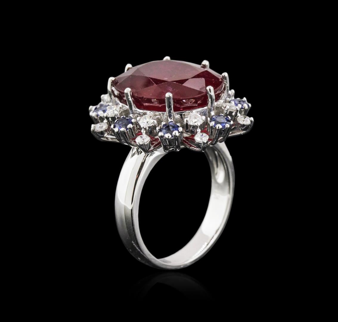 One electronically tested 14KT white gold ladies cast ruby, sapphire and diamond ring with a bright polish finish. Identified with markings of "14K". Condition is new. Containing: One prong set oval modified brilliant cut natural ruby, measuring 15.70 x 13.70 x 8.91mm, approximate weight of 16.30ct., clarity is heavily included, medium, moderately strong, strongly purplish red color, (GIA stpR 5/4), cut is good. Eight prong set round modified brilliant cut natural blue sapphires, measuring 3.60 - 3.60 x 2.34 mm, approximate total weight of 1.92ct., clarity is eye clean, type II, medium, strong, blue color, (GIA B 5/5), cut is good. Sixteen prong set round brilliant cut diamonds, measuring 2.00 - 1.80 x 1.14mm (depth est.) approximate total weight of 16 Stones = 0.40ct. Clarity: SI-1 to I-1. Color: I - J, Cut is Good. Colored gemstones are presumed to have been subjected to commonly used enhancement processes. All diamonds and colored gemstones are graded in the mounting, unless otherwise stated. Total Weight of Colored Stones 18.22ct. Total Weight of Diamonds 0.40ct. Total Weight of Ring 11.20 grams. GGL Appraised at $4,810.00.