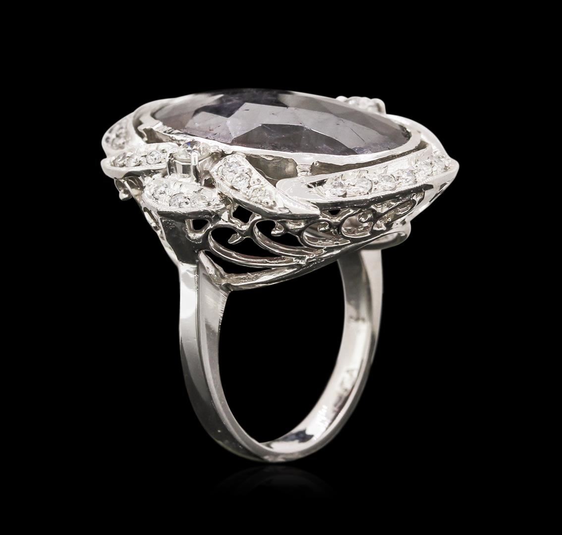One electronically tested 14KT white gold ladies cast ruby and diamond ring with a bright polish finish. Identified with markings of "14K". Condition is very good. Containing: One bezel set oval modified mixed cut natural ruby, measuring 22.50 x 15.50 x 5.50mm, approximate weight of 16.31ct., clarity is severely included, dark, strong, brown color, (GIA Br 7/5)Forty-One prong set round brilliant cut diamonds, measuring 2.50 - 1.50 x 1.20mm (depth est.) approximate total weight of 41 Stones = 0.50ct. Clarity: I-1 to I-2. Color: I - J. Colored gemstones are presumed to have been subjected to commonly used enhancement processes. All diamonds and colored gemstones are graded in the mounting, unless otherwise stated. Total Weight of Colored Stones 16.31ct. Total Weight of Diamonds 0.50ct. Total Weight of Ring 14.50 grams. GGL Appraised at $3,010.00.