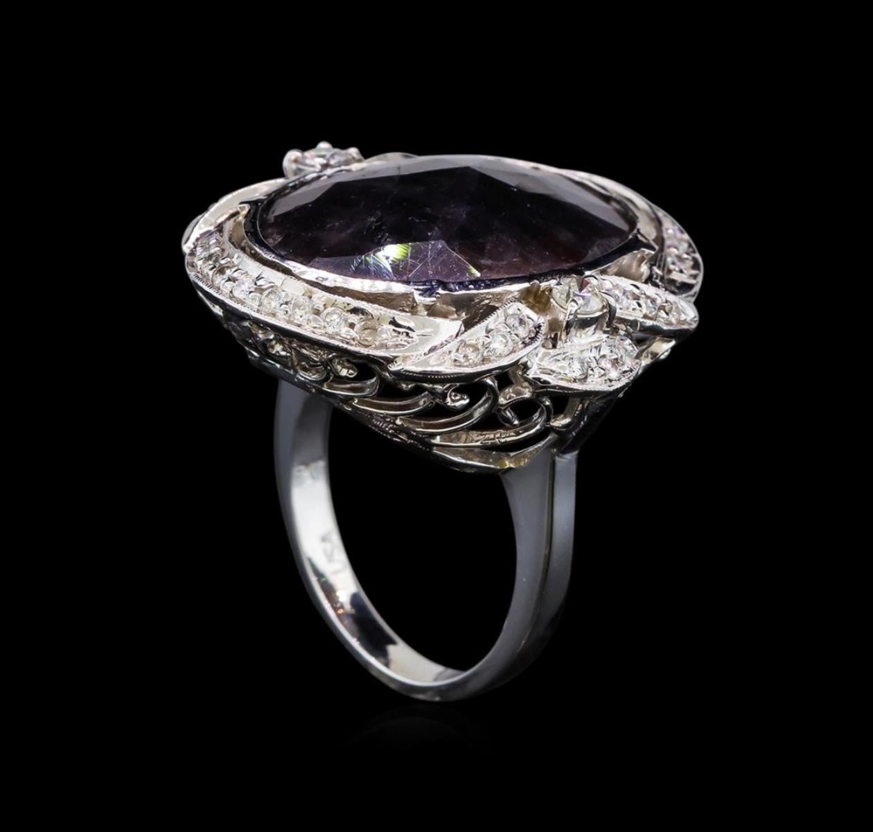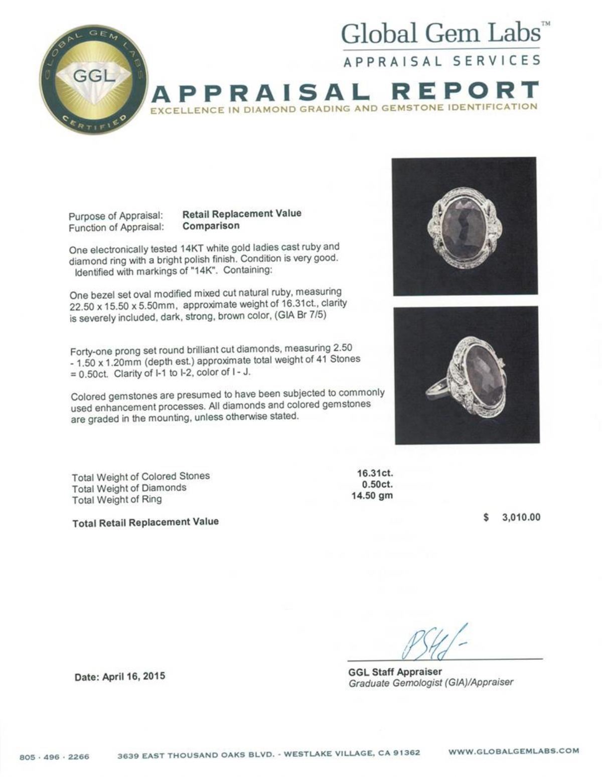 One electronically tested 14KT white gold ladies cast ruby and diamond ring with a bright polish finish. Identified with markings of "14K". Condition is very good. Containing: One bezel set oval modified mixed cut natural ruby, measuring 22.50 x 15.50 x 5.50mm, approximate weight of 16.31ct., clarity is severely included, dark, strong, brown color, (GIA Br 7/5)Forty-One prong set round brilliant cut diamonds, measuring 2.50 - 1.50 x 1.20mm (depth est.) approximate total weight of 41 Stones = 0.50 ct. Clarity: I-1 to I-2. Color: I - J. Colored gemstones are presumed to have been subjected to commonly used enhancement processes. All diamonds and colored gemstones are graded in the mounting, unless otherwise stated. Total Weight of Colored Stones 16.31ct. Total Weight of Diamonds 0.50 ct. Total Weight of Ring 14.50 grams. GGL Appraised.
