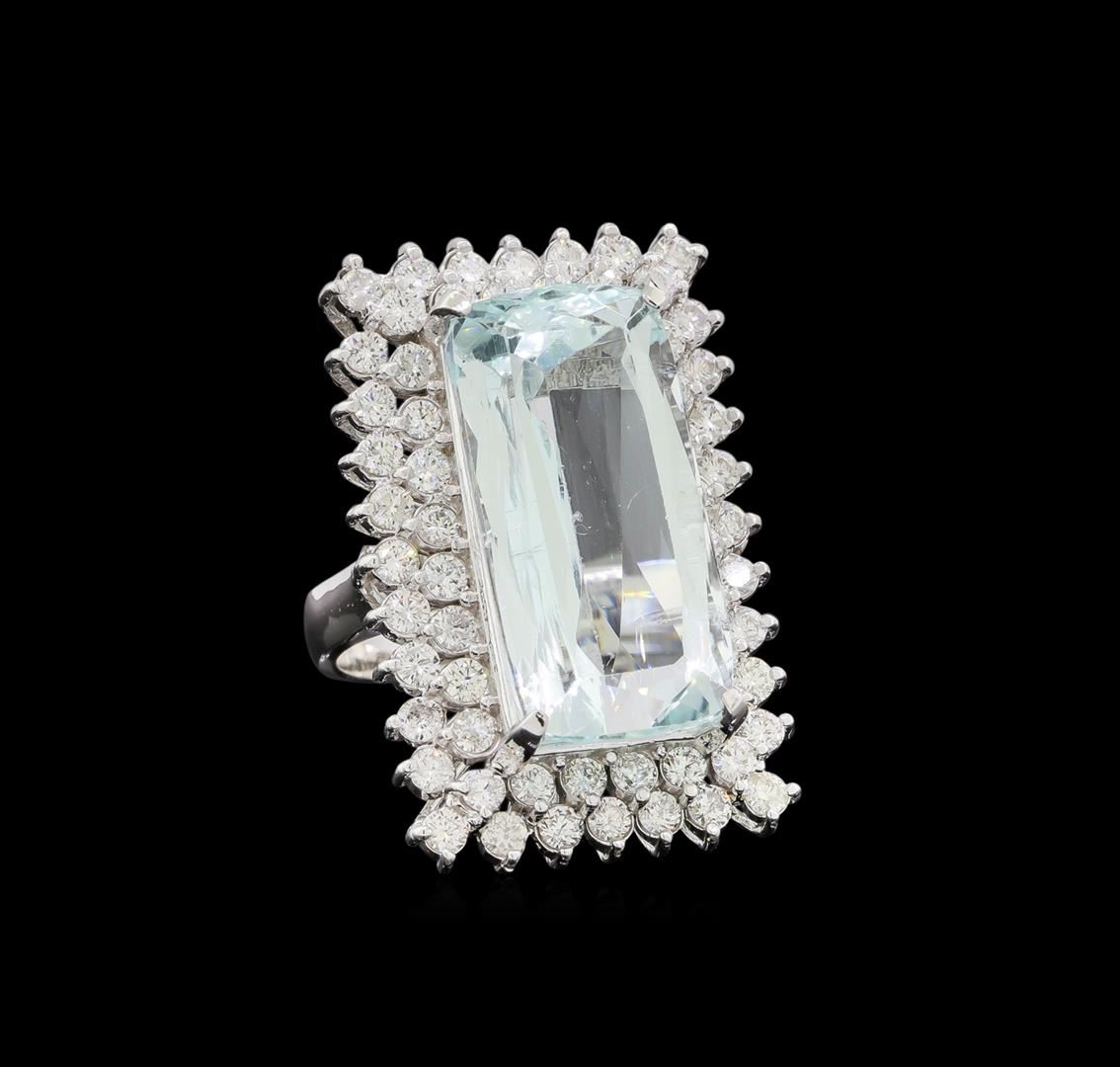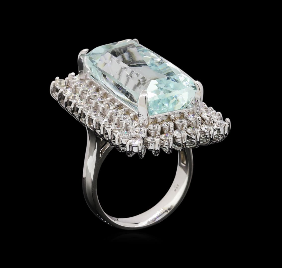 One electronically tested 14KT white gold ladies cast aquamarine and diamond ring with a bright polish finish. Identified with markings of "K14". Condition is new. Containing: One prong set rectangular cushion modified brilliant cut natural aquamarine, measuring 23.23 x 11.69 x 9.50mm, approximate weight of 16.49ct., clarity is eye clean, type I, light, slightly grayish, blue color, (GIA B 3/2), cut is good. Sixty prong set round brilliant cut diamonds, measuring 2.40 - 2.40 x 1.44mm (depth est.) approximate total weight of 60 Stones = 3.04ct. Clarity: SI-2 to I-1. Color: I - J, Cut is Good. Colored gemstones are presumed to have been subjected to commonly used enhancement processes. All diamonds and colored gemstones are graded in the mounting, unless otherwise stated. Total Weight of Colored Stones 16.49ct. Total Weight of Diamonds 3.04ct. Total Weight of Ring 16.80 grams. GGL Appraised at $10,915.00.