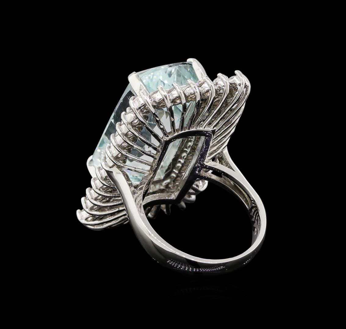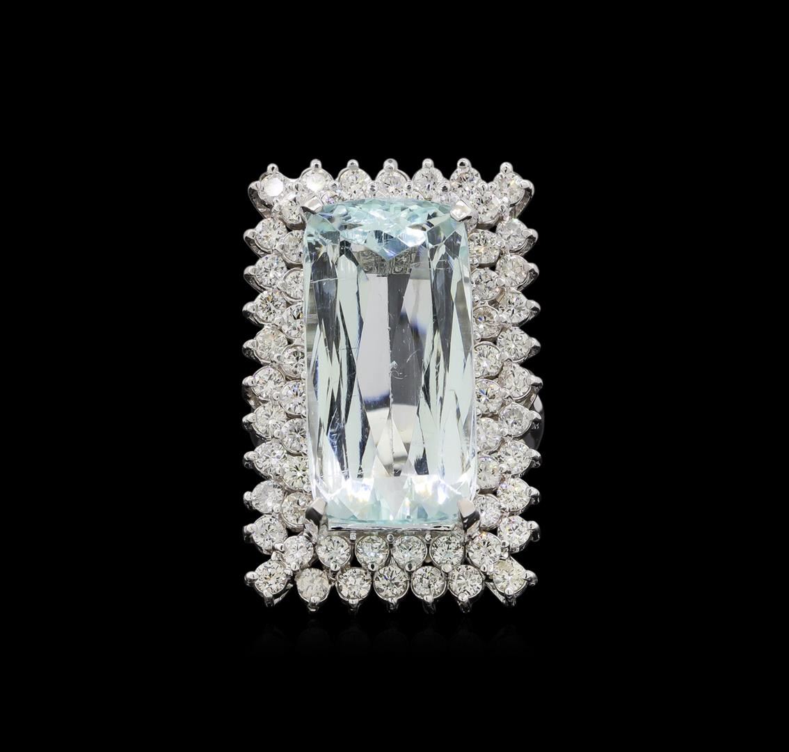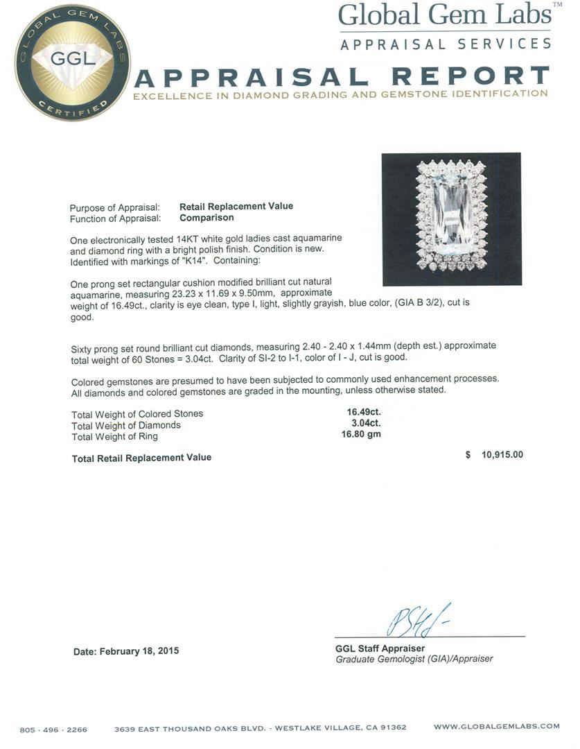 One electronically tested 14KT white gold ladies cast aquamarine and diamond ring with a bright polish finish. Identified with markings of "K14". Condition is new. Containing: One prong set rectangular cushion modified brilliant cut natural aquamarine, measuring 23.23 x 11.69 x 9.50mm, approximate weight of 16.49ct., clarity is eye clean, type I, light, slightly grayish, blue color, (GIA B 3/2), cut is good. Sixty prong set round brilliant cut diamonds, measuring 2.40 - 2.40 x 1.44mm (depth est.) approximate total weight of 60 Stones = 3.04ct. Clarity: SI-2 to I-1. Color: I - J, Cut is Good. Colored gemstones are presumed to have been subjected to commonly used enhancement processes. All diamonds and colored gemstones are graded in the mounting, unless otherwise stated. Total Weight of Colored Stones 16.49ct. Total Weight of Diamonds 3.04ct. Total Weight of Ring 16.80 grams. GGL Appraised at $10,915.00.