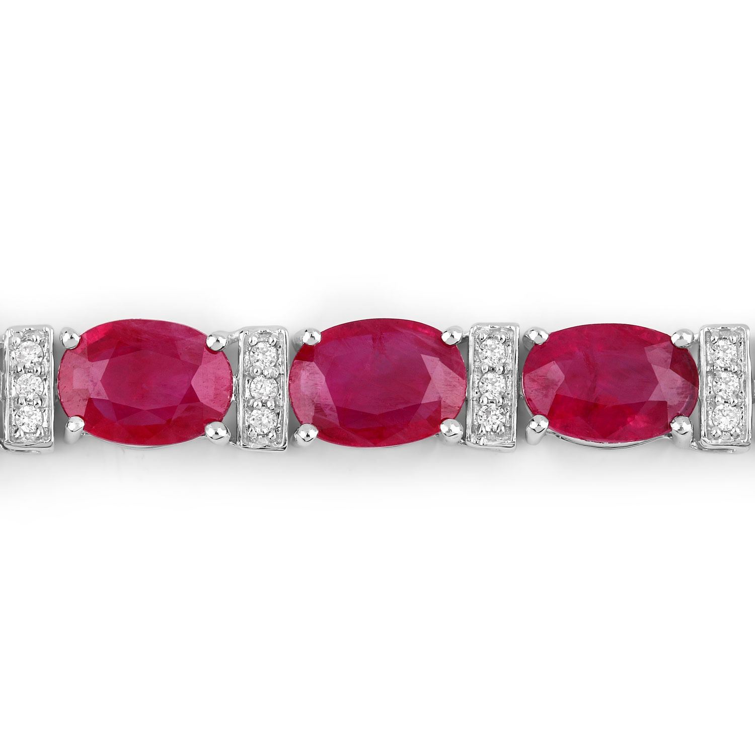 One 14KT White Gold 16.52ctw Ruby and Diamond Bracelet. (19) Rubies with a total weight of 16.15cts. These natural Rubies have been heat treated. (57) round diamonds with a total weight of 0.37cts with a color of H-I and a clarity of i1. Total wight of this bracelet is 12.02 grams. Total lenght of this bracelet is 7 inches.
