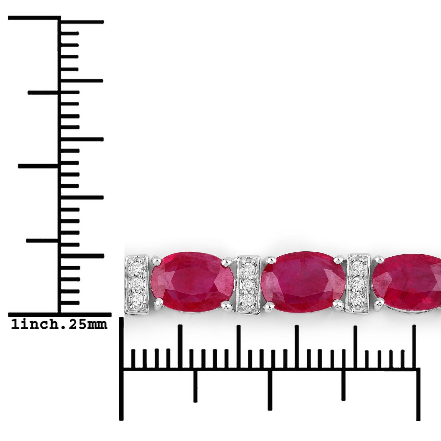 One 14KT White Gold 16.52ctw Ruby and Diamond Bracelet. (19) Rubies with a total weight of 16.15cts. These natural Rubies have been heat treated. (57) round diamonds with a total weight of 0.37cts with a color of H-I and a clarity of i1. Total wight of this bracelet is 12.02 grams. Total lenght of this bracelet is 7 inches.