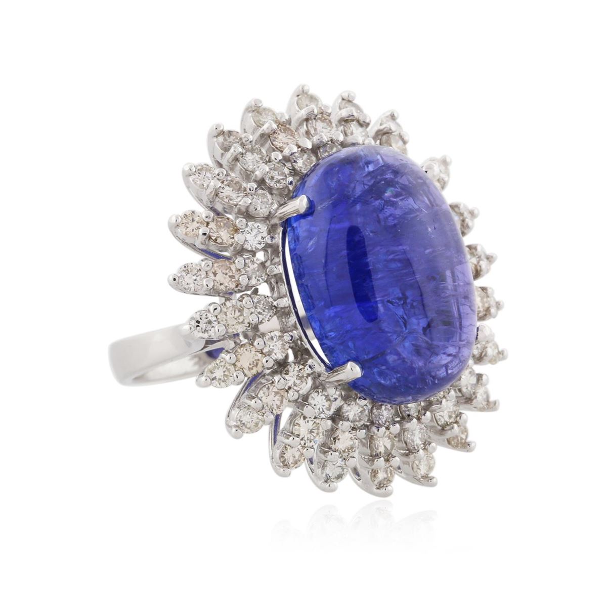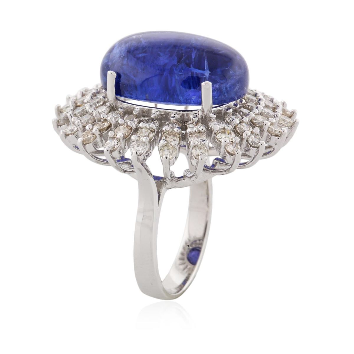 One electronically tested 14KT white gold ladies cast tanzanite and diamond ring with a bright polish finish. The featured tanzanite is set within a floral diamond bezel, completed by a three millimeter wide band. Identified with markings of "K14". Condition is new, good workmanship. Containing: One prong set oval cabochon cut natural tanzanite, measuring 18.00 x 12.65 x 8.10mm, approximate weight of 16.78ct., clarity is heavily included, type I, medium dark, very slightly grayish, bluish violet color, (GIA bV 6/3), cut is good. Transmitting light somewhat diffusely, transparent to translucent. Naturally occurring internal & external characteristics are present. Colored Stone Grading Report attached. Graded in the setting. Tanzanite is a very rare gemstone that is only found in the country of Tanzania. Originally discovered in 1967. Tiffany & Company, named the stone Tanzanite. It is found in the Usumburu Mountains that border the Umba Valley of northern Tanzania. Tanzanite occurs in gray, brown, violet, blue, reddish-purple, & green. The gem is interesting because of its exceptional pleochroism. Rotated in different directions a tanzanite will exhibit multiple changes of color. Tanzanite has a low tolerance to ultrasonic cleaning, and should not be cleaned using this method. Sixty-Six prong set round brilliant cut diamonds, measuring 2.10 - 2.00 x 1.23mm (depth est.) approximate. Total Weight of 66 Stones = 2.18ct. Faint brown secondary color throughout. Graded in the setting. Clarity: SI-1 to I-1. Color: I - K. Total Weight of Colored Stones 16.78ct. Total Weight of Diamonds 2.18ct. AIG Appraised at $18,380.00.