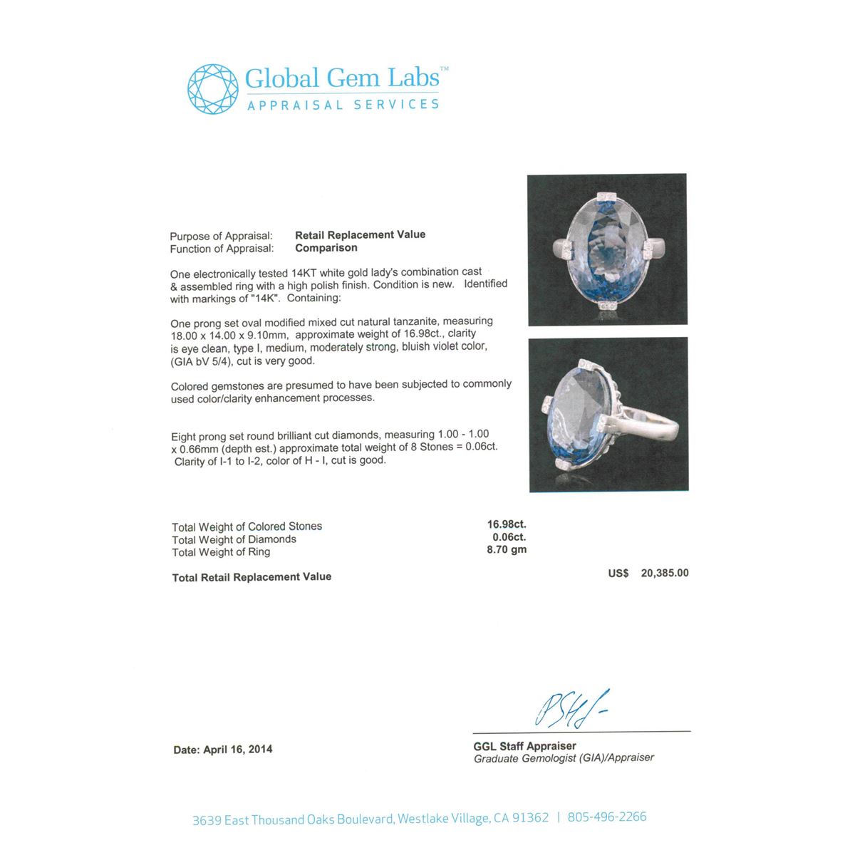 One electronically tested 14KT white gold Ladies combination cast & assembled ring with a high polish finish. Condition is new. Identified with markings of "14K". Containing: One prong set oval modified mixed cut natural tanzanite, measuring 18.00 x 14.00 x 9.10mm, approximate weight of 16.98ct., clarity is eye clean, type I, medium, moderately strong, bluish violet color, (GIA bV 5/4), cut is very good. Colored gemstones are presumed to have been subjected to commonly used color/clarity enhancement processes. Eight prong set round brilliant cut diamonds, measuring 1.00 - 1.00 x 0.66mm (depth est.) approximate. Total Weight of 8 Stones = 0.06ct. Clarity: I-1 to I-2. Color: H - I, Cut is Good. Total Weight of Colored Stones 16.98ct. Total Weight of Diamonds 0.06ct. Total Weight of Ring 8.70 grams. GGL Appraised at $20,385.00.