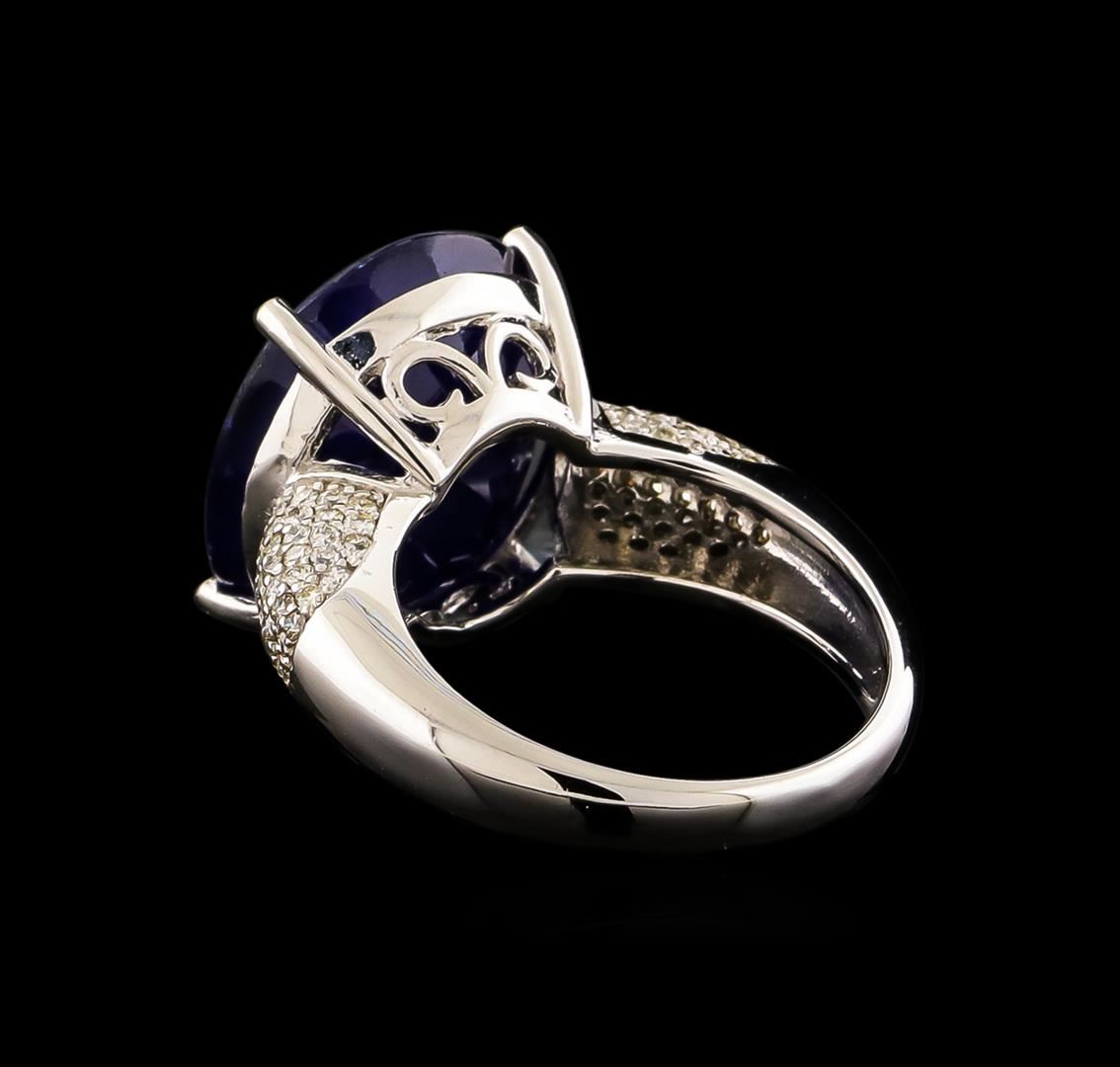 One electronically tested 14KT white gold ladies cast dyed sapphire and diamond ring with a bright polish finish. Condition is new, good workmanship. The featured dyed sapphire is supported by diamond set shoulders, completed by a three millimeter wide band. Identified with markings of "K14". Containing: One prong set oval mixed cut natural dyed sapphire, measuring 16.50 x 14.50 x 8.20mm, 8%. bulge factor, approximate weight of 17.02ct., clarity is severely included, dark, very slightly grayish, blue color, (GIA B 7/3), cut is good. Transmitting light very diffusely, opaque. Naturally occurring internal & external characteristics are present. Indications of multiple laboratory enhancements, including high temperature heat treatment and dye. Graded in the setting. Ninety-Six pav, set round brilliant cut diamonds, measuring 1.20 - 1.10 x 0.69mm (depth est.) approximate. Total Weight of 96 Stones = 0.62ct. Graded in the setting. Clarity: SI-1 to I-1. Color: H - J. Total Weight of Colored Stones 17.02ct. Total Weight of Diamonds 0.62ct. Total Weight of Ring 8.77 grams. AIG Appraised at $3,825.00.