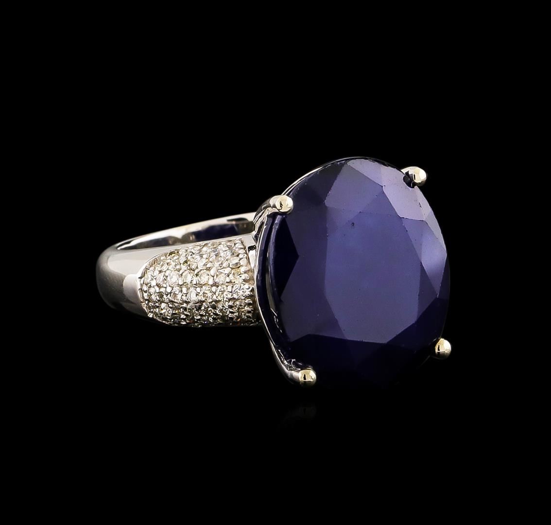 One electronically tested 14KT white gold ladies cast dyed sapphire and diamond ring with a bright polish finish. Condition is new, good workmanship. The featured dyed sapphire is supported by diamond set shoulders, completed by a three millimeter wide band. Identified with markings of "K14". Containing: One prong set oval mixed cut natural dyed sapphire, measuring 16.50 x 14.50 x 8.20mm, 8%. bulge factor, approximate weight of 17.02ct., clarity is severely included, dark, very slightly grayish, blue color, (GIA B 7/3), cut is good. Transmitting light very diffusely, opaque. Naturally occurring internal & external characteristics are present. Indications of multiple laboratory enhancements, including high temperature heat treatment and dye. Graded in the setting. Ninety-Six pav, set round brilliant cut diamonds, measuring 1.20 - 1.10 x 0.69mm (depth est.) approximate. Total Weight of 96 Stones = 0.62ct. Graded in the setting. Clarity: SI-1 to I-1. Color: H - J. Total Weight of Colored Stones 17.02ct. Total Weight of Diamonds 0.62ct. Total Weight of Ring 8.77 grams. AIG Appraised at $3,825.00.