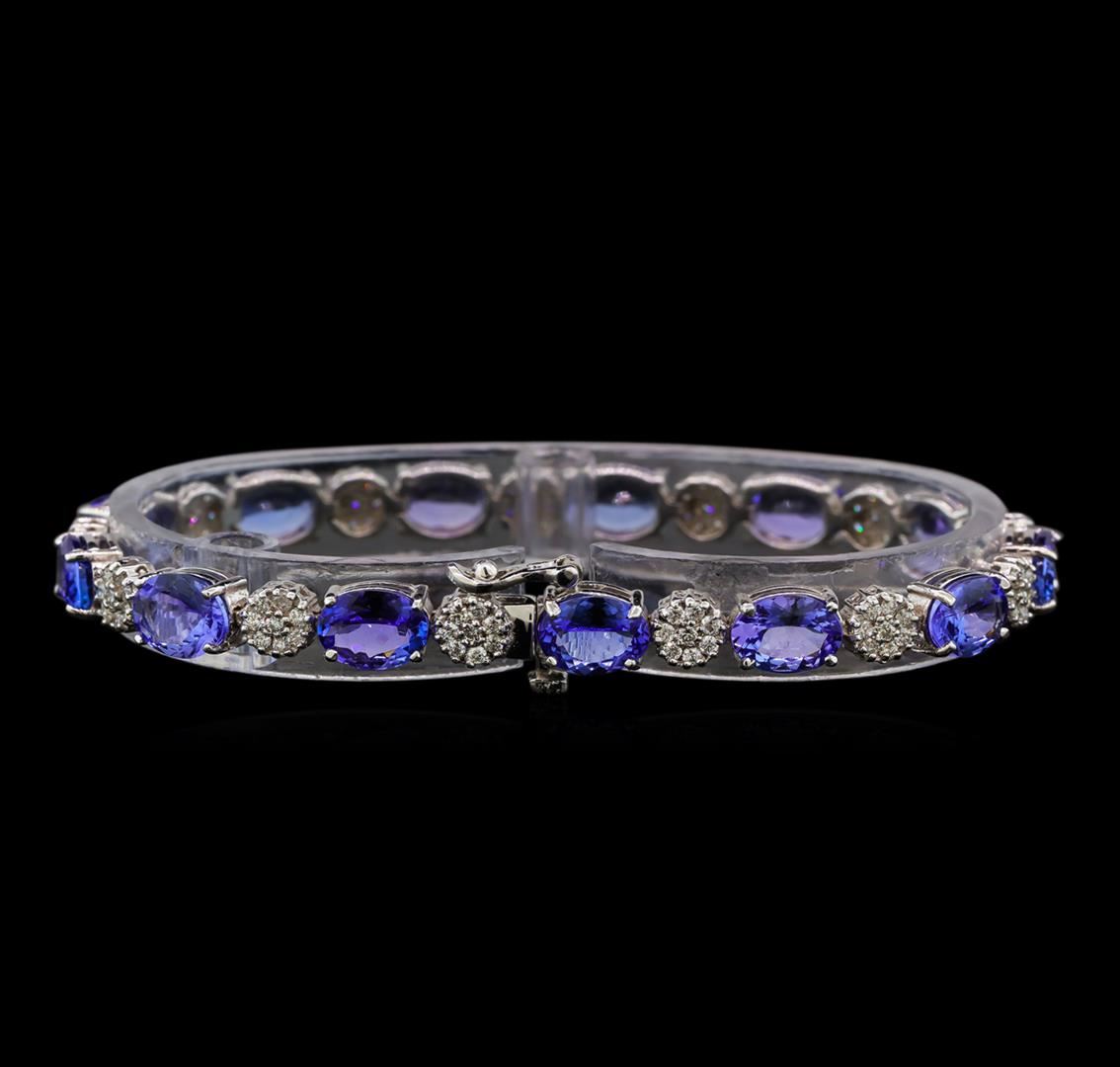 One electronically tested 14KT white gold ladies cast tanzanite and diamond bracelet with a hidden box clasp with safety closer with a bright polish finish. Measurements: 7" in length. Identified with markings of "14K". Condition is new. Containing: Thirteen prong set oval modified brilliant cut natural tanzanites, measuring 8.00. x 6.00. x 3.90mm, approximate total weight of 17.16ct., clarity is eye clean, type I, medium light, very slightly grayish, violet color, (GIA V 4/3), cut is good. One Hundred Four prong set round brilliant cut diamonds, measuring 1.30 - 1.30 x 0.78mm (depth est.) approximate total weight of 104 Stones = 0.83ct. Clarity: SI-2 to I-1. Color: I - J, Cut is Good. Colored gemstones are presumed to have been subjected to commonly used enhancement processes. All diamonds and colored gemstones are graded in the mounting, unless otherwise stated. Total Weight of Colored Stones 17.16ct. Total Weight of Diamonds 0.83ct. Total Weight of Bracelet 15.00 grams. GGL Appraised at $7,700.00.